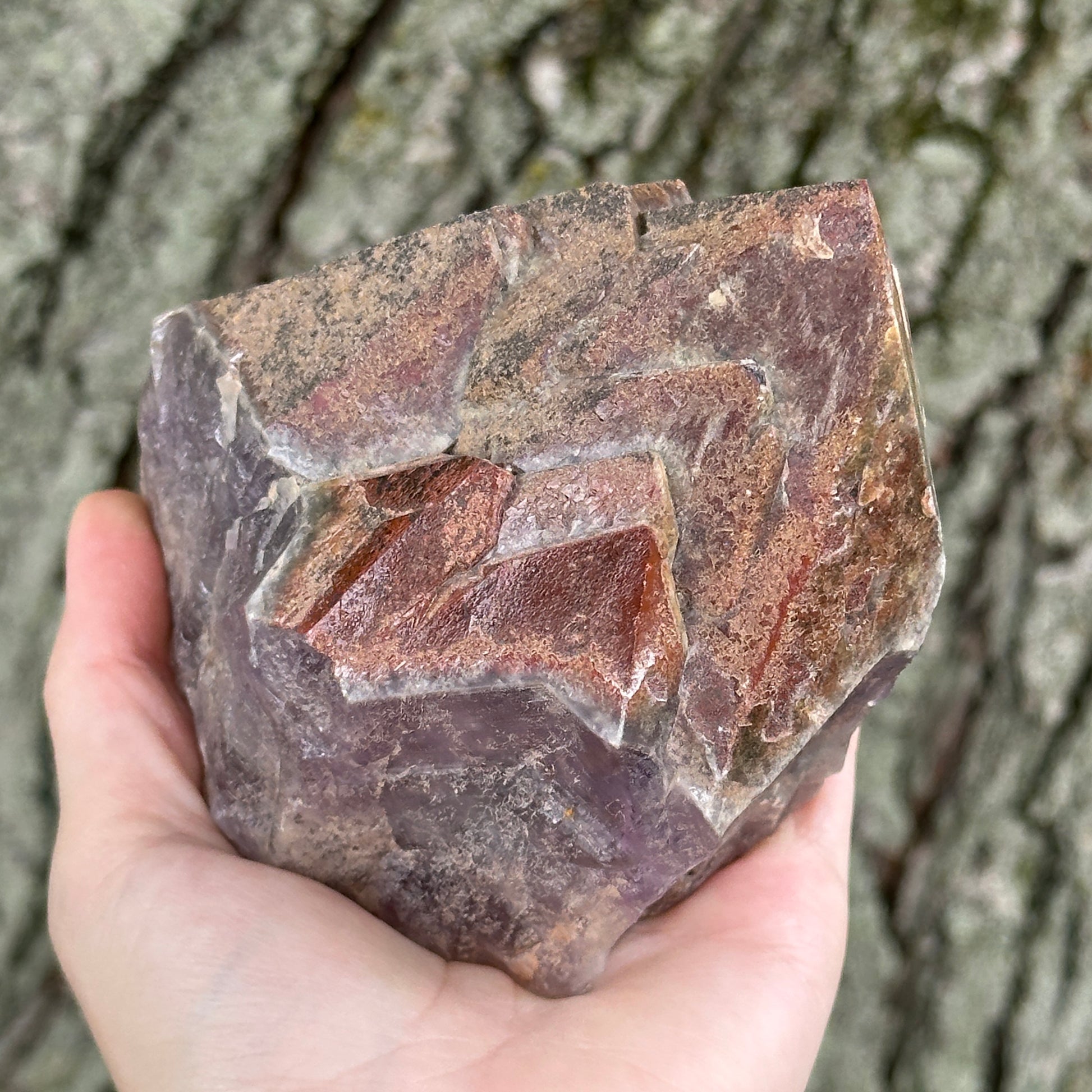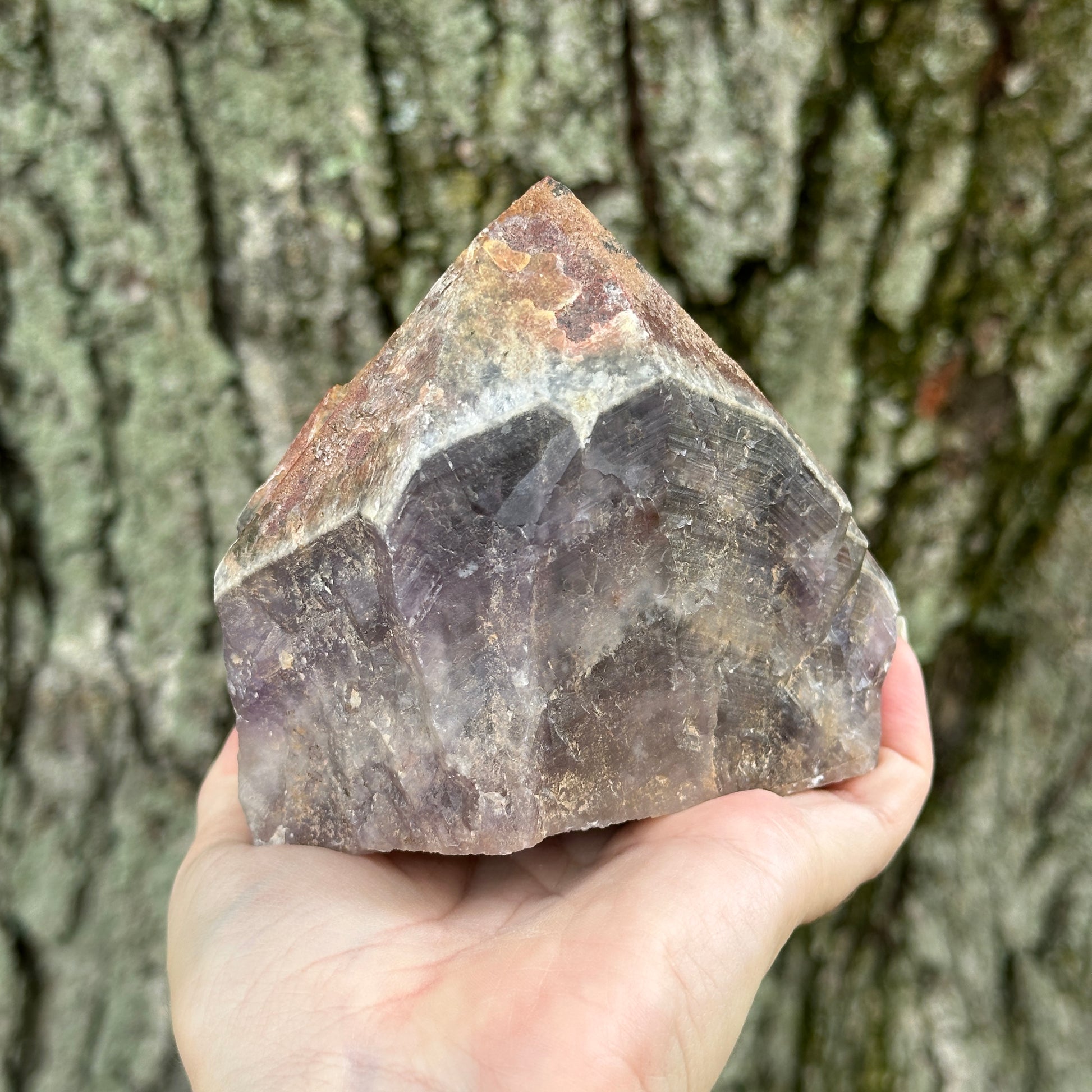 The crystals themselves are structured layers of phantomed chevrons composed of three base quartz species: Amethyst, Citrine, and a rare form of metamict Green Quartz. The mineral compounds they contain reportedly include Titanite, Cacoxenite, Lepidocrosite, Ajoite, Hematite, Magnetite, Pyrite, Goethite, Pyrolusite, Gold, Silver, Platinum, Nickel, Copper, Iron, Limonite, Sphalerite, Covellite, Chalcopyrite, Gialite, Epidote, Bornite, and Rutile.