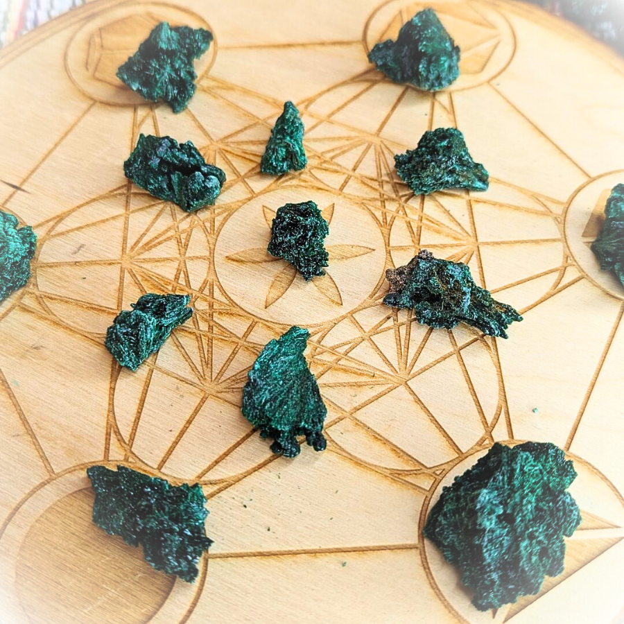 • A Grid Base: Many choose a wooden grid board with sacred geometry patterns engraved—like the Flower of Life, Seed of Life, Metatron’s Cube, or Celtic Cross. These forms act as spiritual blueprints, amplifying intention and divine order.