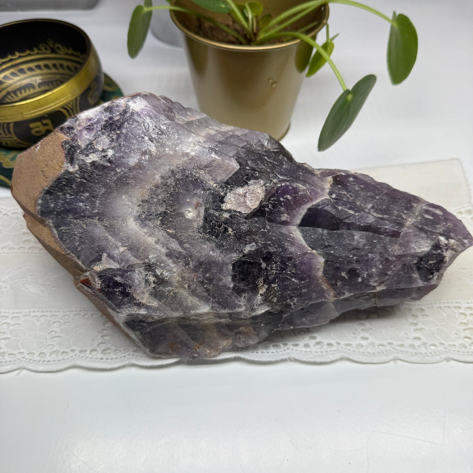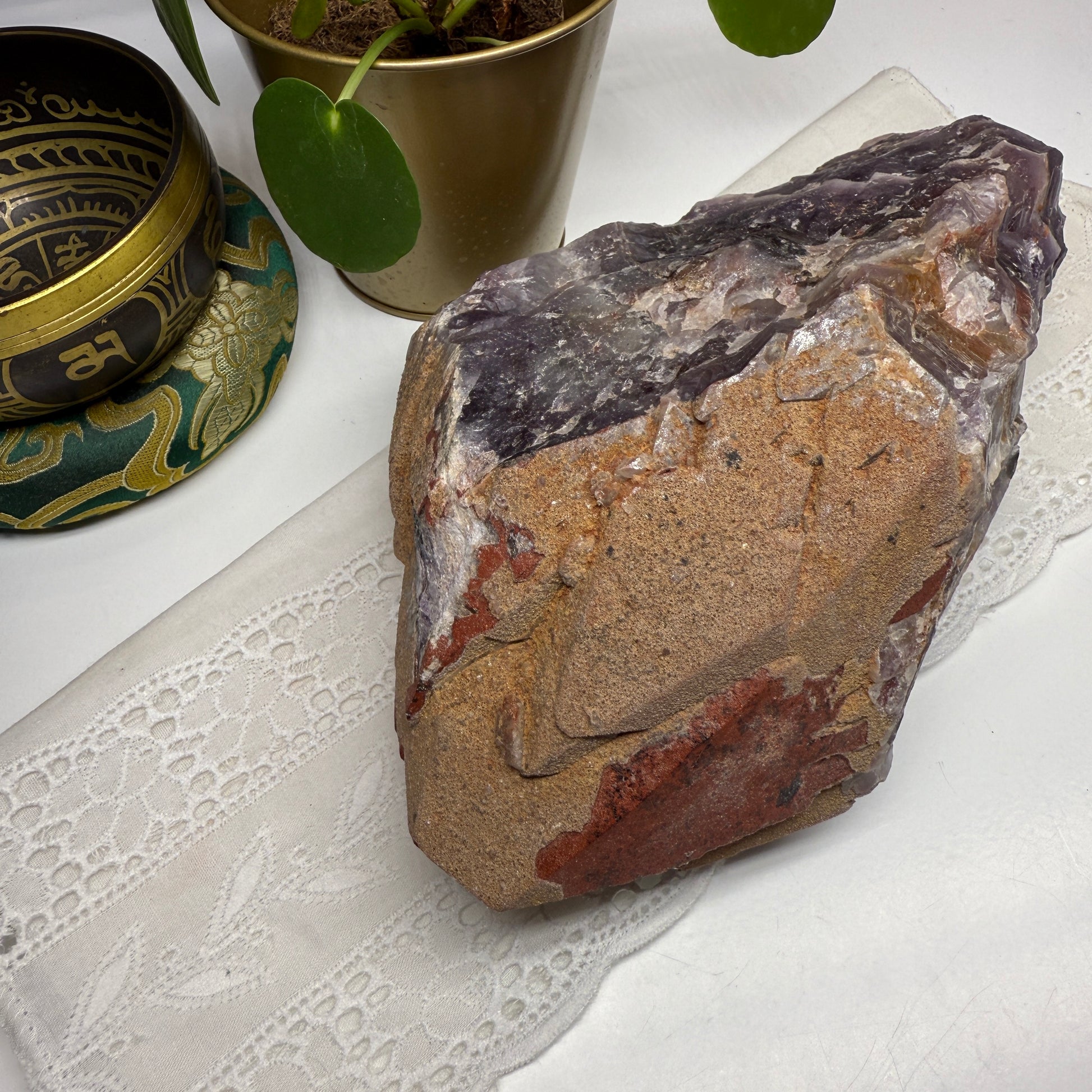 - Deep Purple & Red Hematite Capped Termination: A rich blend of high-vibrational Amethyst and iron-rich Hematite, symbolizing both spiritual wisdom and grounding stability.