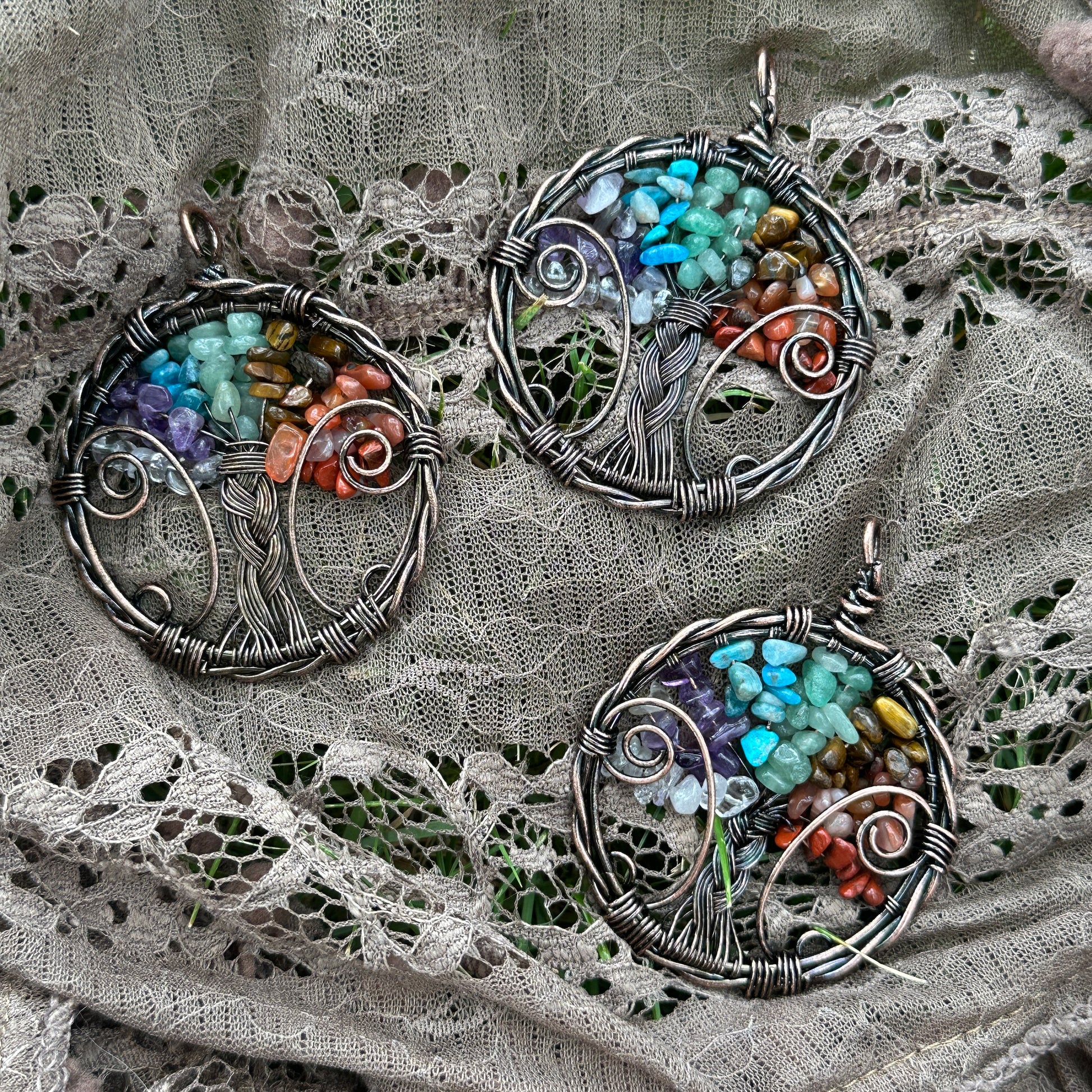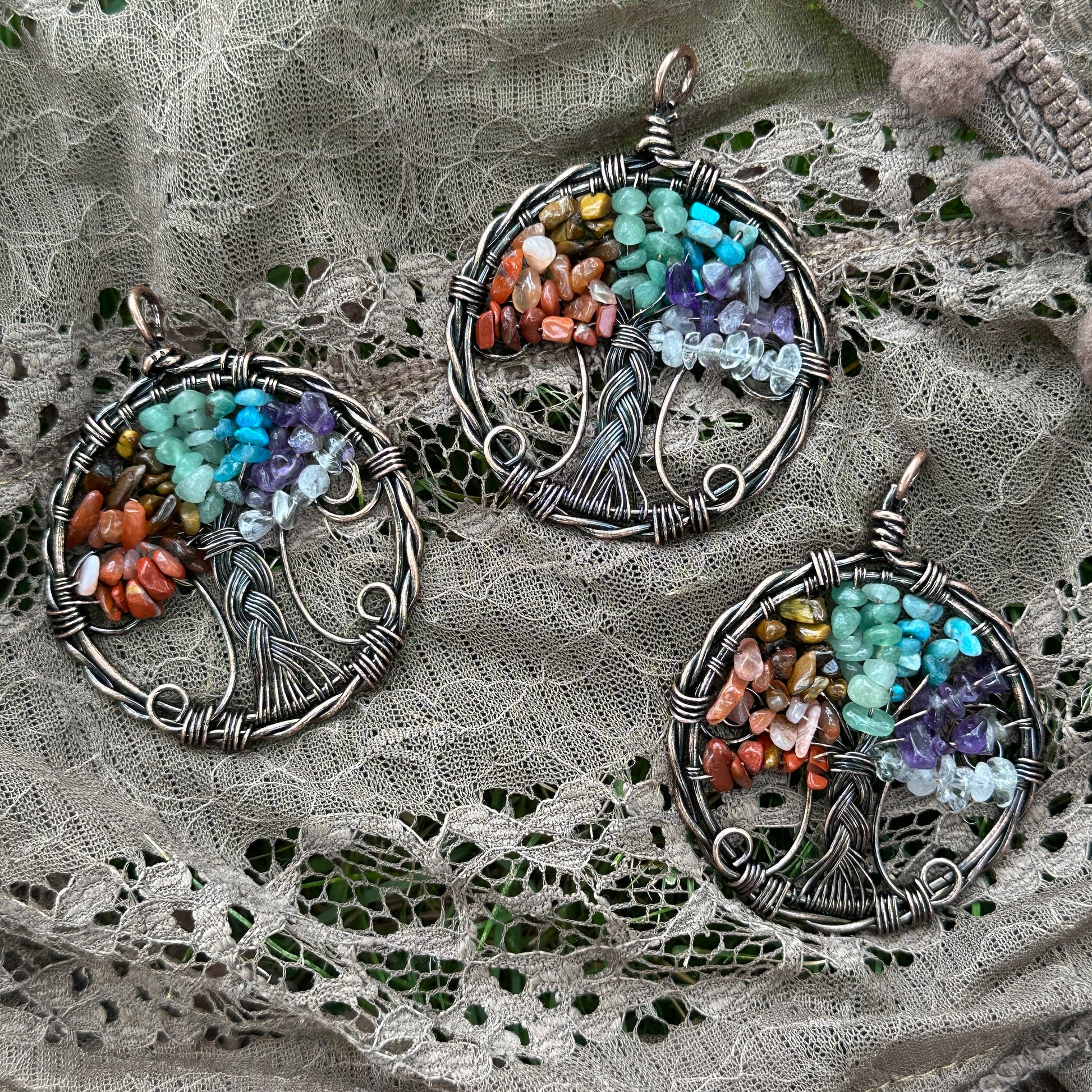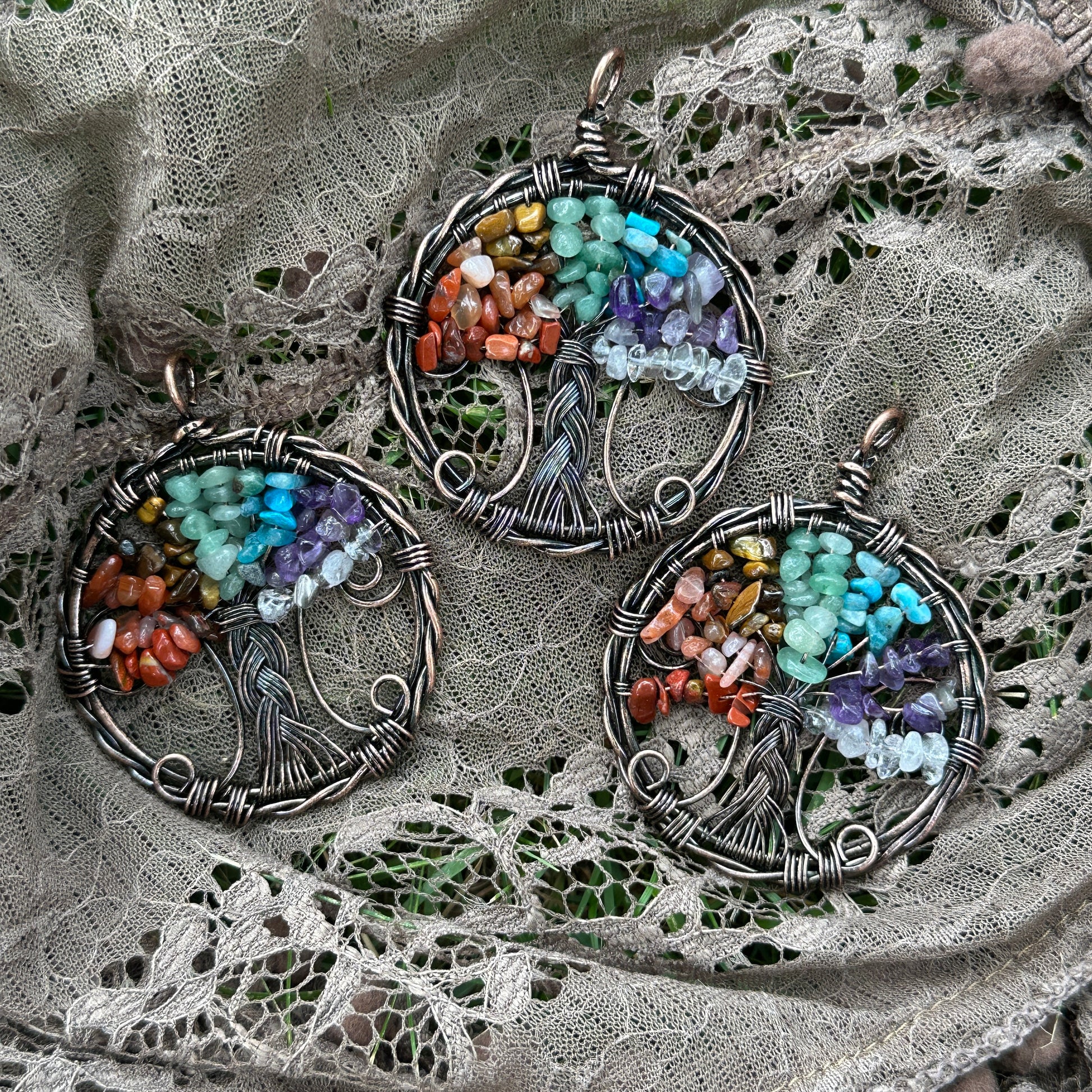 Stunning Tree of Life pendants featuring intricate wire wrapping and seven different stones to ground you and balance your chakras.