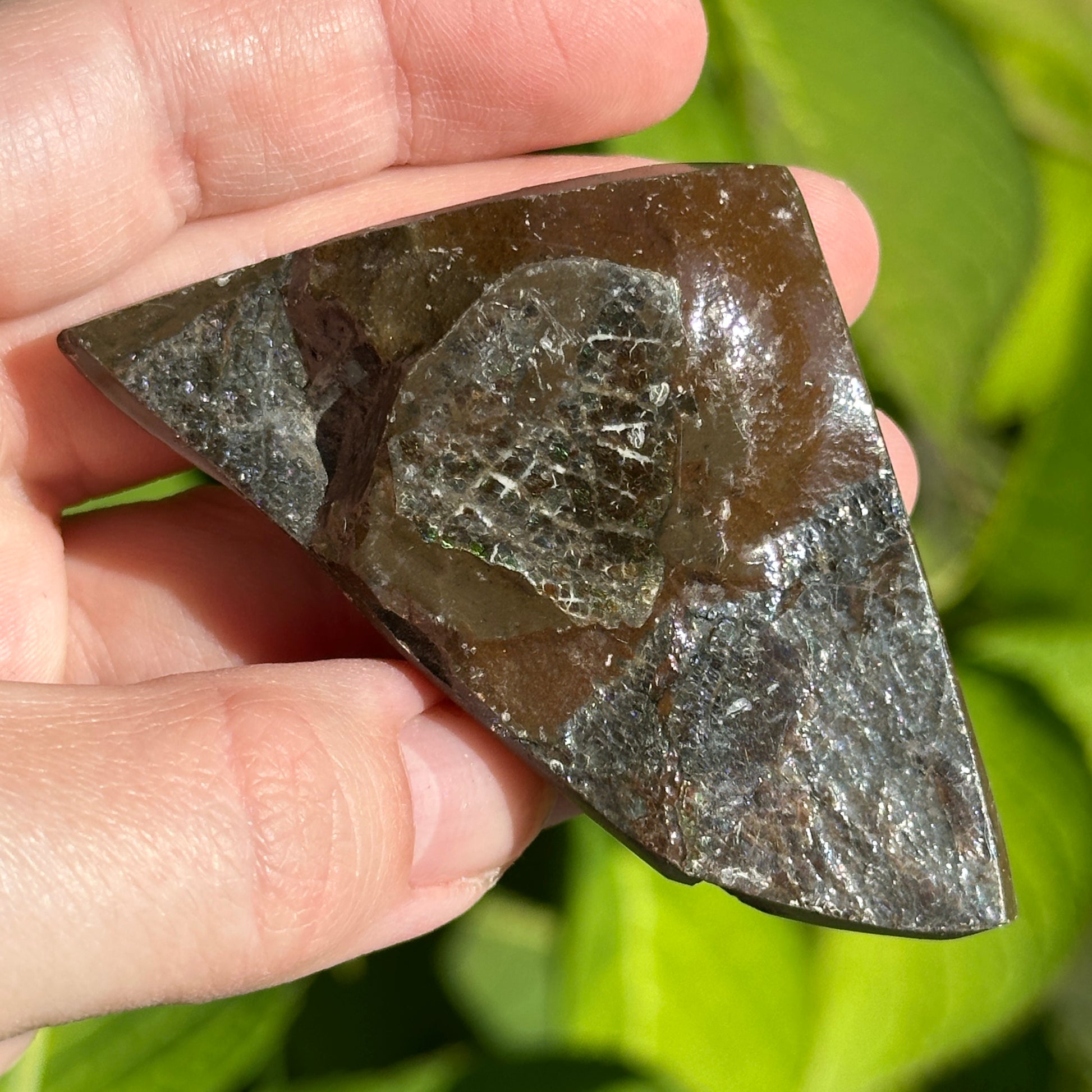Ammolite may bring about abundance, good luck, and prosperity. This incredible stone is known for potentially attracting miracles into one's life. Ammolite is an opal-like organic gemstone found primarily along the eastern slopes of the Rocky Mountains of North America, mainly in Alberta. It is made of the fossilized shells of Ammonites, which in turn are composed primarily of Aragonite - the same mineral contained in nacre - with a micro-structure inherited from the shell.