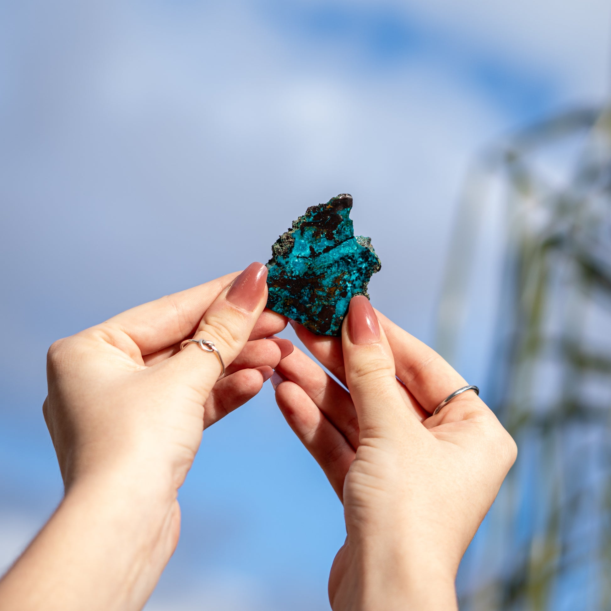 Chrysocolla is a hydrated copper silicate mineral commonly found alongside secondary copper minerals such as Shattuckite. Shattuckite, a copper silicate hydroxide, contributes deep blue tones and enhances perception, intuition, and higher awareness. When these two minerals form together, they create a natural balance between emotional soothing and mental clarity.