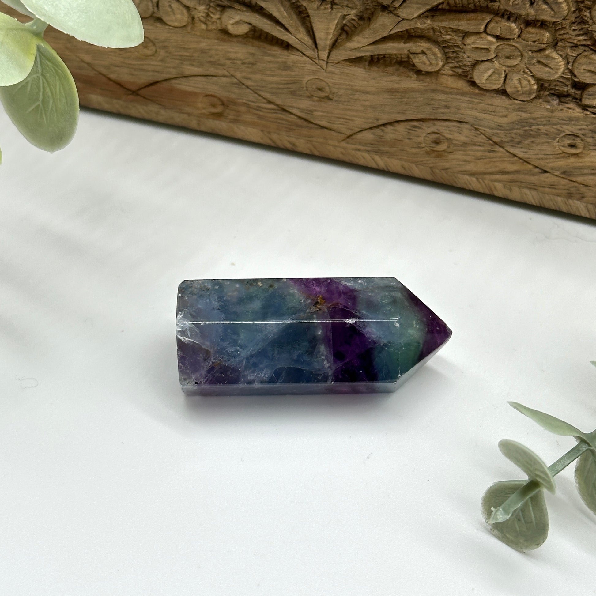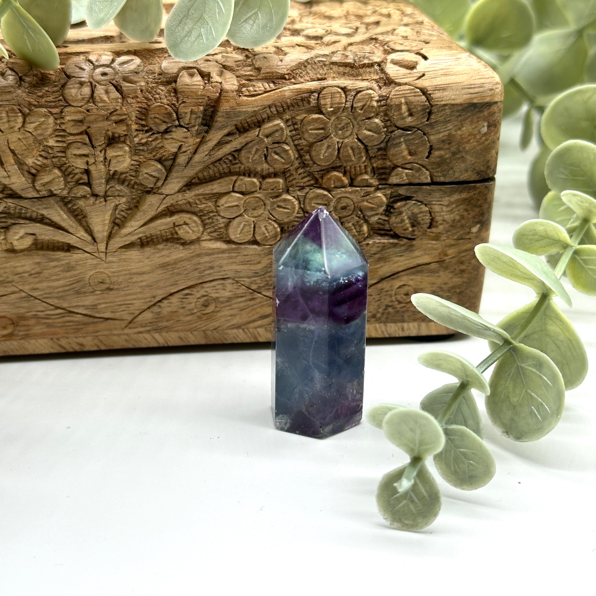 Fluorite is a powerful crystal for mental clarity, spiritual growth, and energy healing. This Purple and Teal Rainbow Fluorite Crystal Tower Carving works to enhance your intuition, clear blockages in your energy field, and promote emotional healing. The blue hues encourage communication and self-expression, while the purple tones support spiritual insight and higher consciousness. The golden bands of this tower promote optimism, abundance, and personal power. It is a perfect crystal for meditation, energy clearing, or simply bringing a calming, focused energy into your environment.