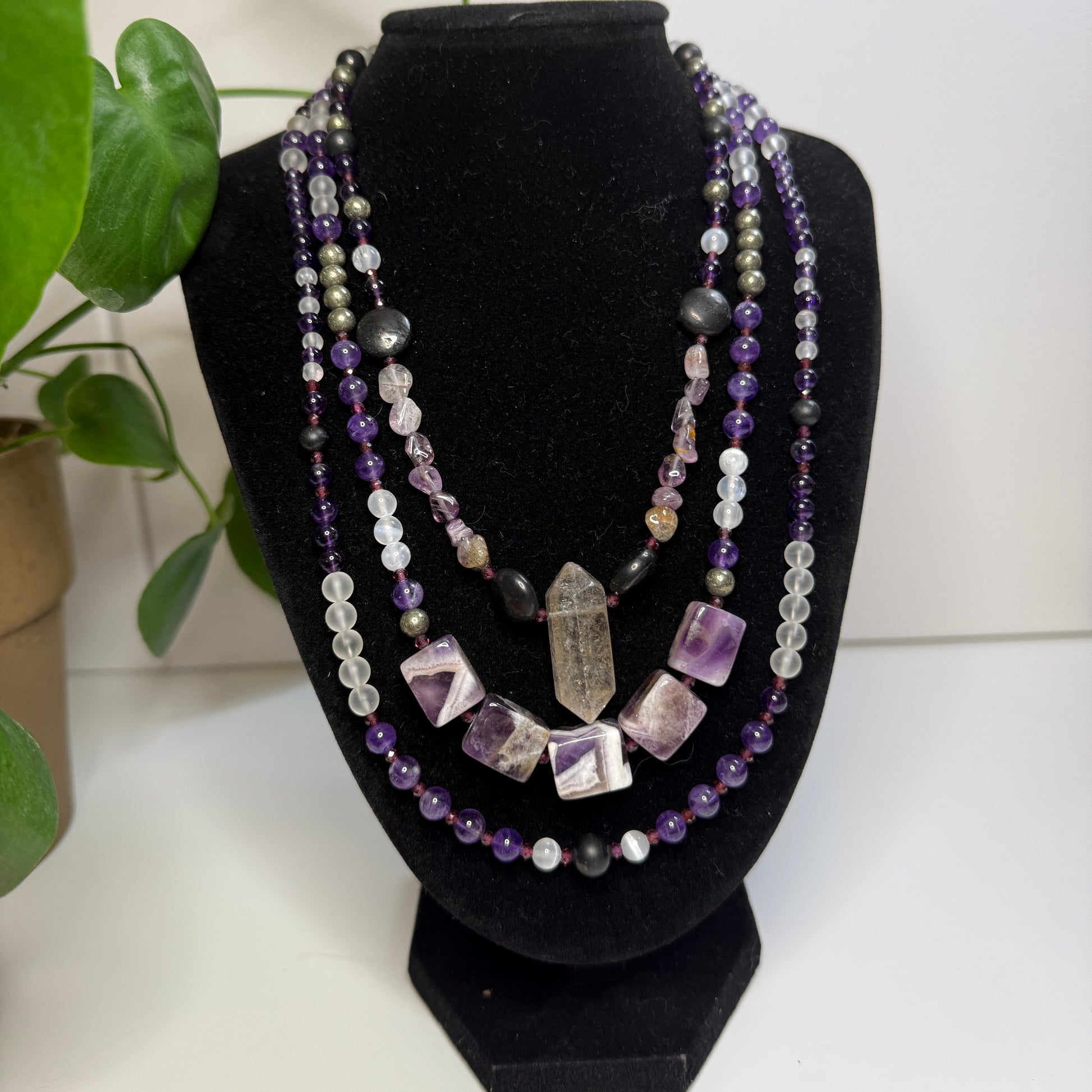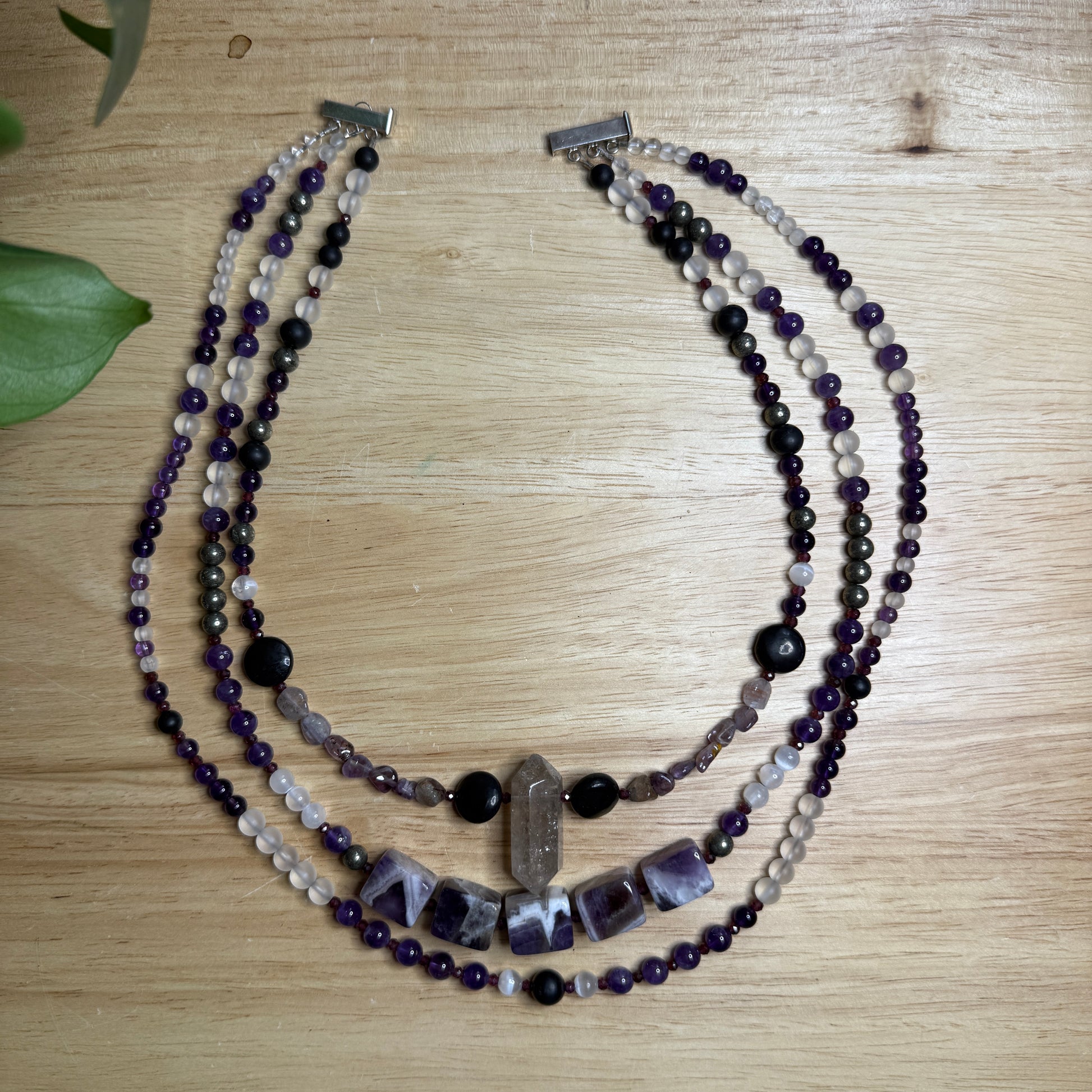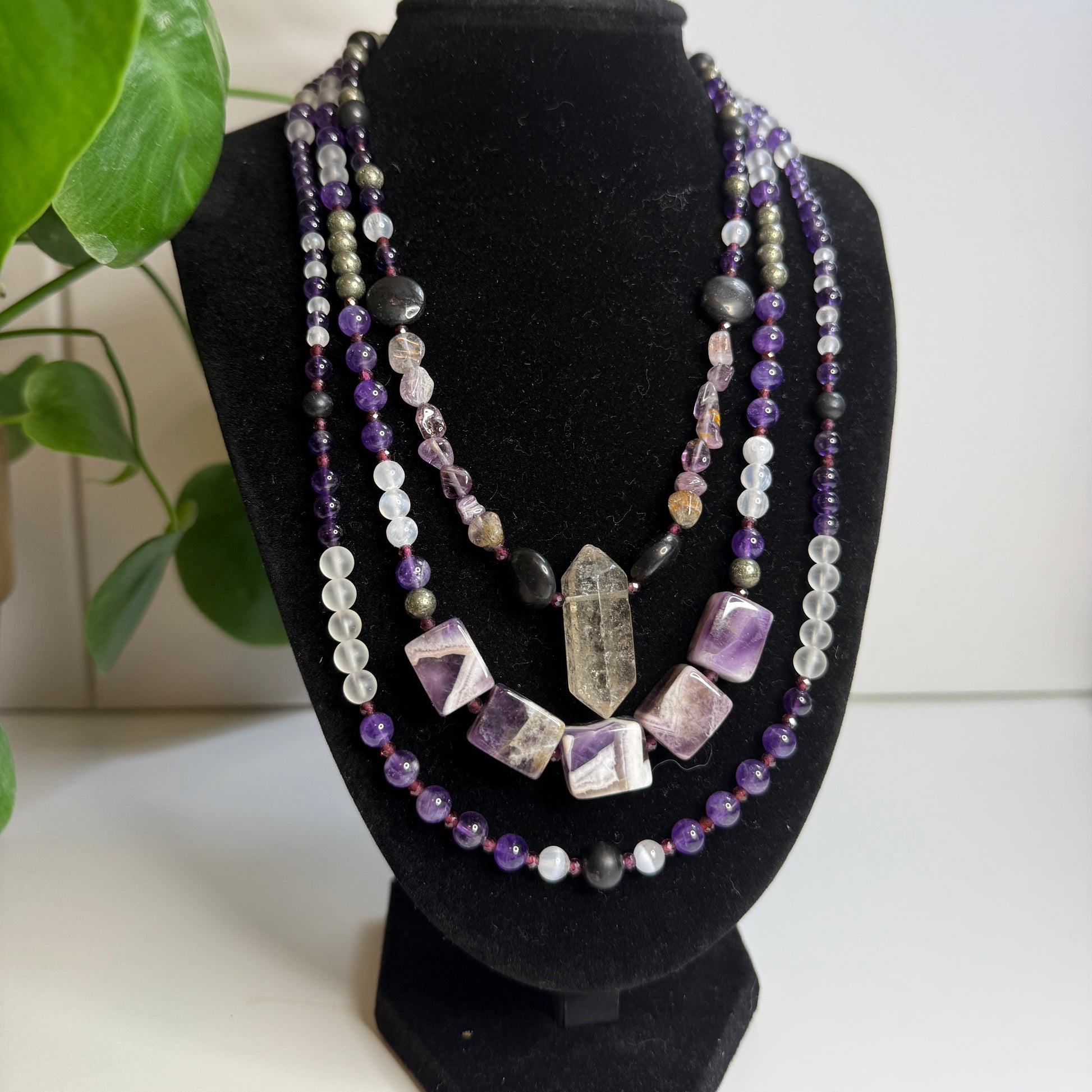Goddess Energy Necklace: A Handmade Blend of Amethyst, Phantom Quartz, Shungite, Pyrite, and Red Garnet