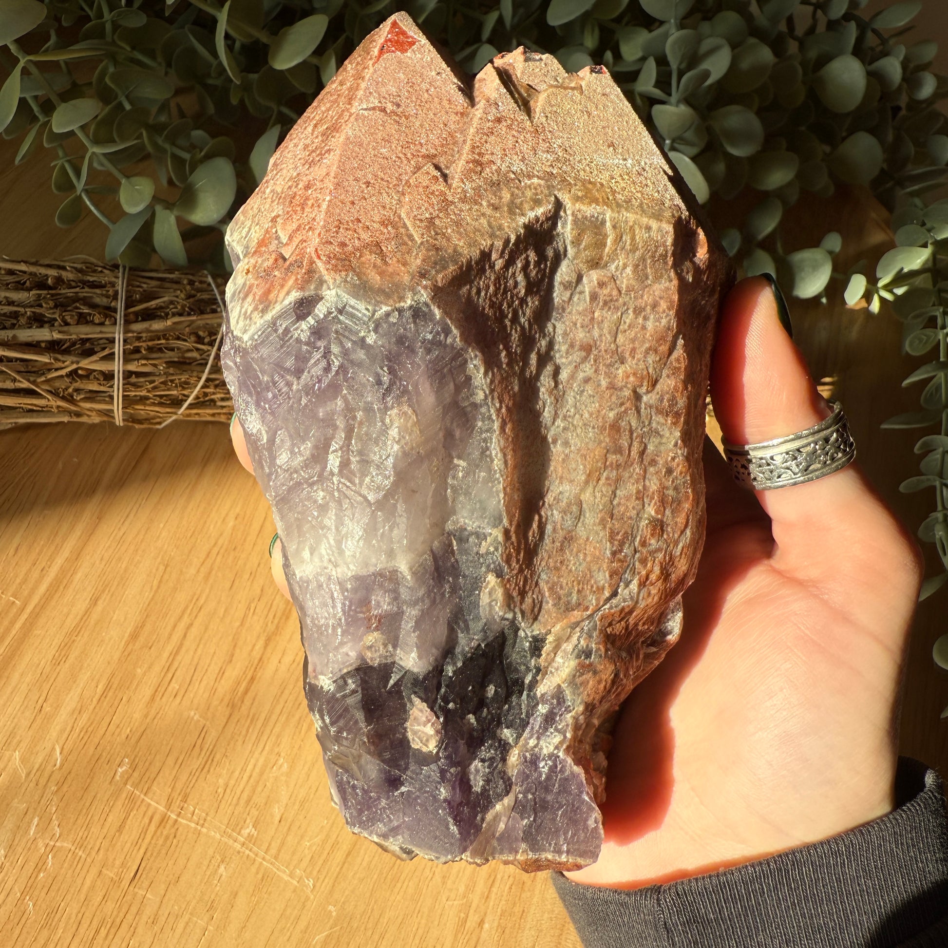 - Hematite Crusting: A shimmering layer of Hematite at the base or edges adds grounding and protective energy to the crystal’s high-frequency vibrations.