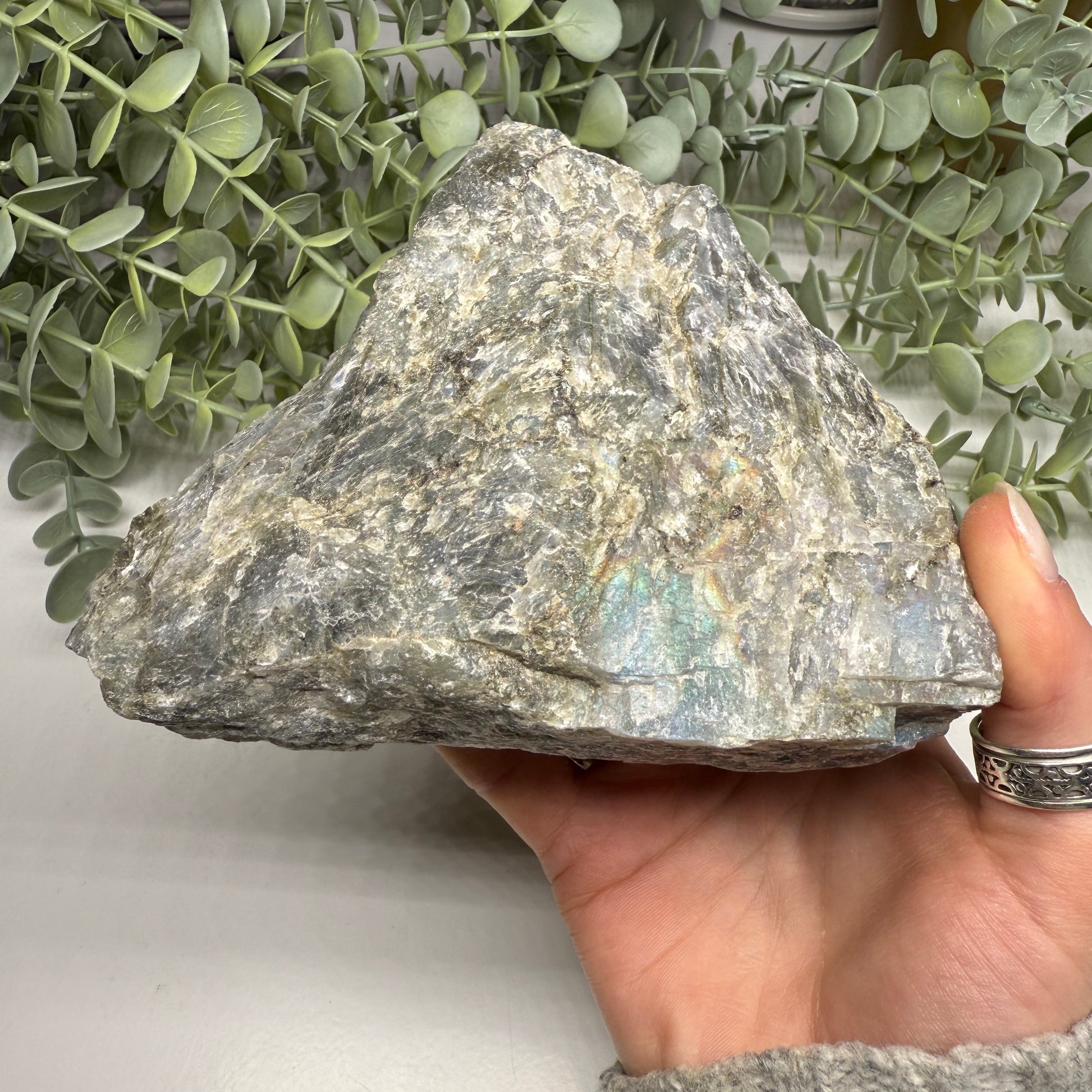 This Large Rough Labradorite Natural Specimen is a striking crystal known for its iridescent flashes of color, often displaying shades of blue, green, gold, and violet. Revered as the Stone of Magic, Labradorite enhances intuition, strengthens spiritual connections, and provides powerful protective energy. Its raw, natural formation retains its organic beauty while holding deep transformative energy, making it a must-have for collectors, healers, and crystal enthusiasts.
