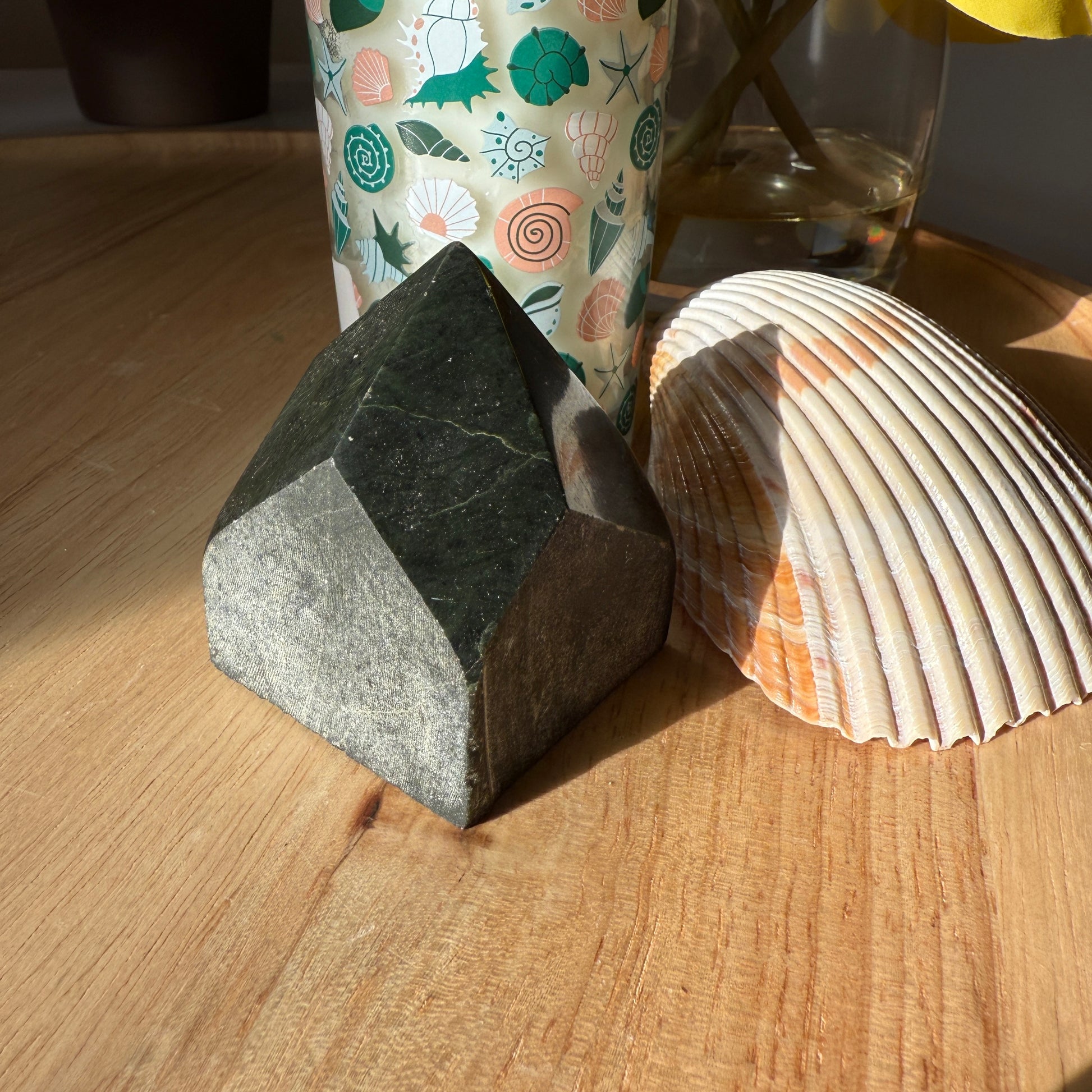 Nephrite Jade is a cherished gemstone known for its grounding energy, protective qualities, and deep connection to wisdom and prosperity. This partially polished carving display point showcases the natural beauty of the stone while enhancing its energetic properties, making it a meaningful centerpiece for any space.