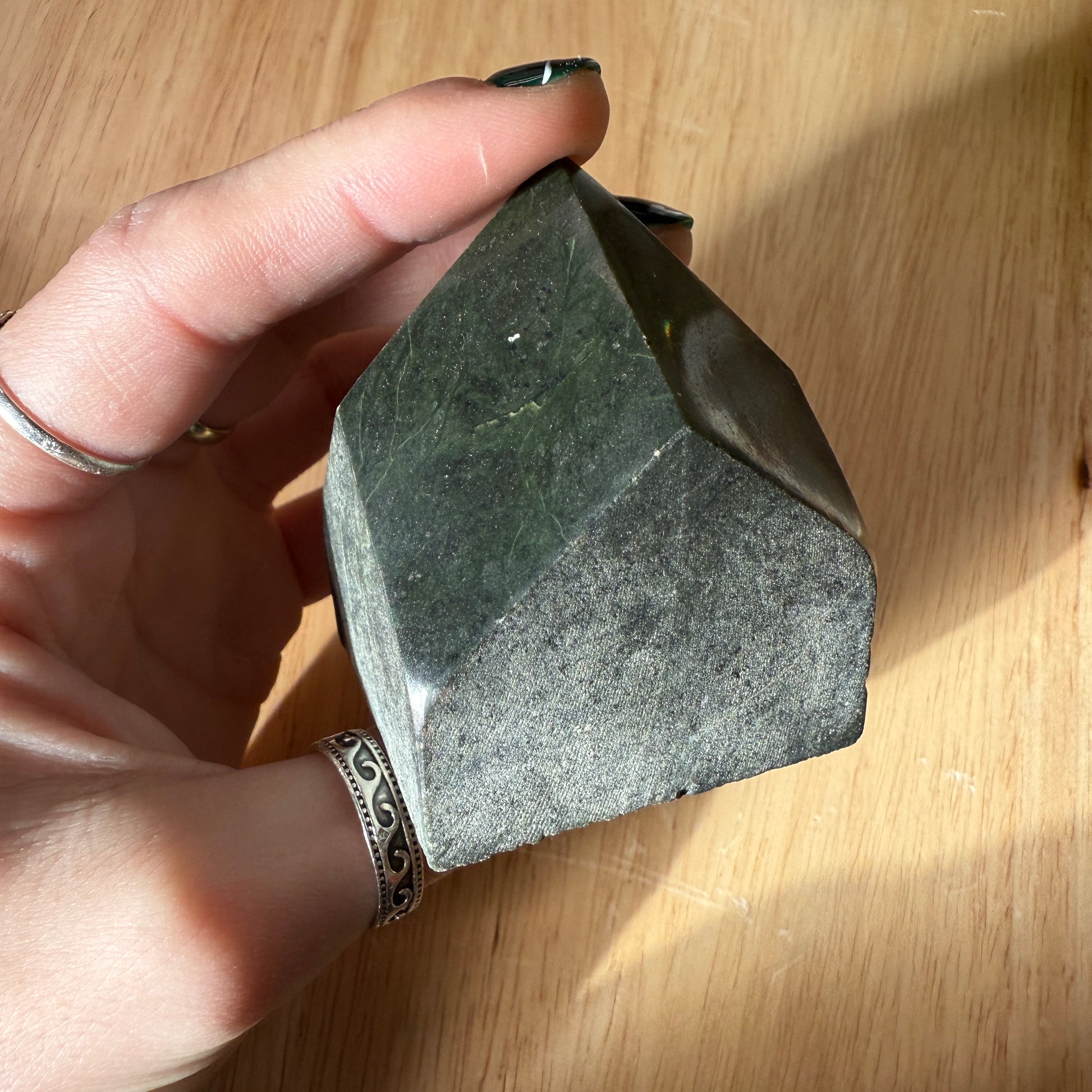 - Partially Polished Finish: Combines raw and polished surfaces, highlighting the stone’s natural textures and deep green tones.