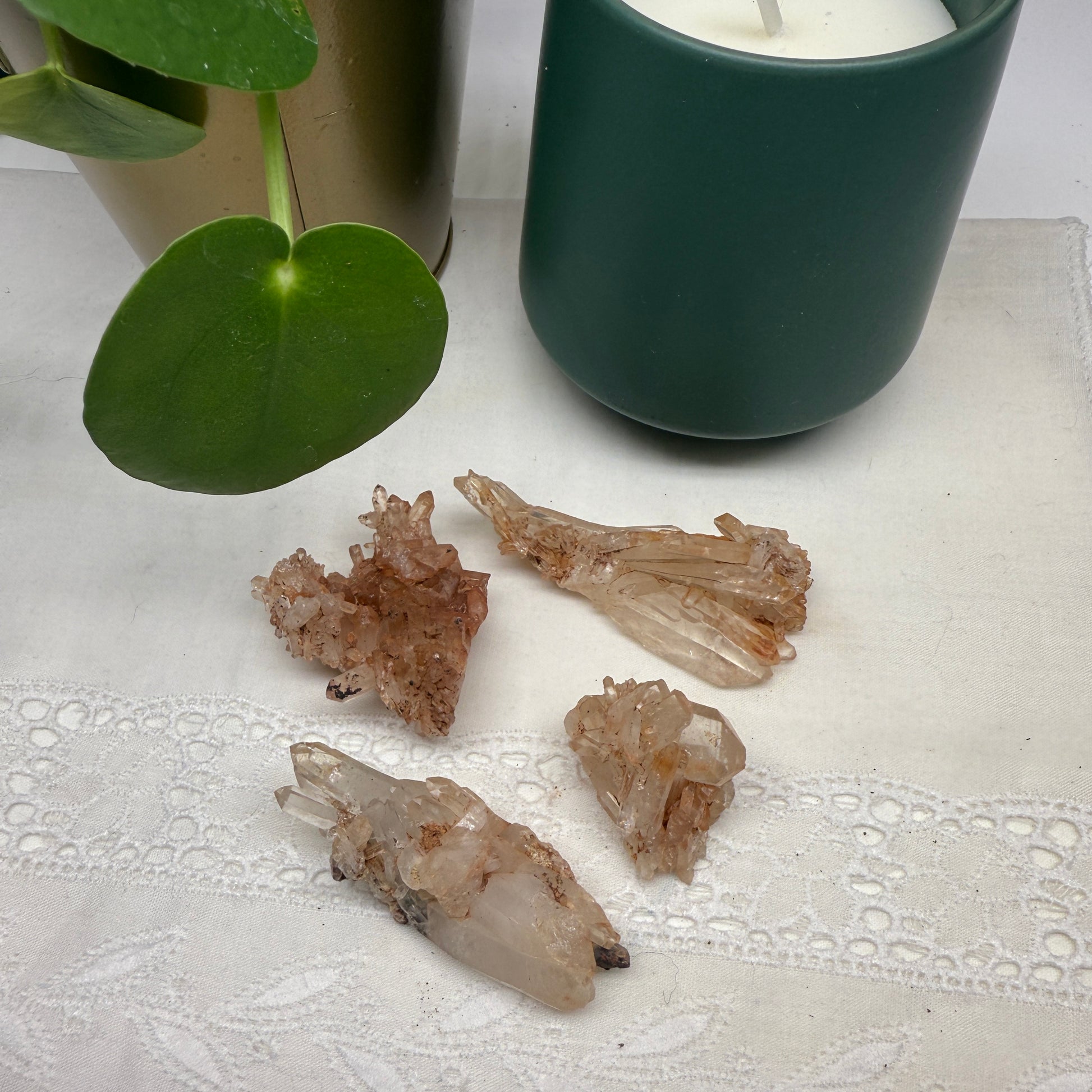 This Self-Healed Fire Quartz Crystal Cluster from Madagascar is a rare and powerful crystal that embodies strength, transformation, and renewal. Fire Quartz, also known as Hematoid Quartz, is a high-energy stone that combines the amplifying power of Quartz with the grounding properties of Hematite. The self-healed formations signify growth, resilience, and the ability to overcome challenges, making this a perfect crystal for those on a journey of self-discovery and healing.