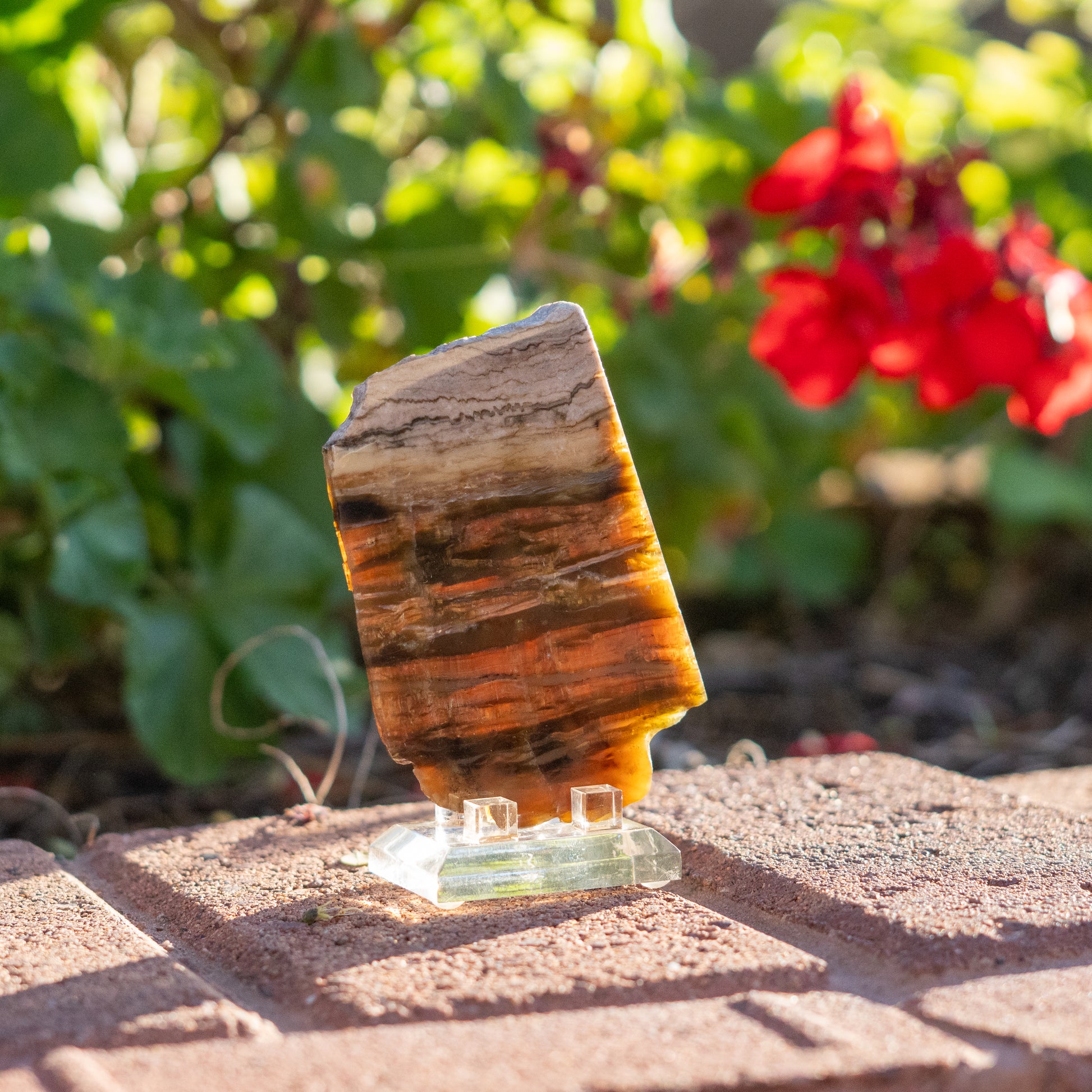 Formed within the ancient landscapes of Arizona, this rare American Pietersite slice carries the unmistakable energy of a gathering storm—both anchoring and electrifying at once. Known as the Tempest Stone, Pietersite is revered for its swirling, chatoyant patterns that seem alive with motion, reflecting its role as a catalyst for inner strength, decisive clarity, and fearless self-expression. This polished slice was selected for its dramatic storm-like bands of gold, brown, and red, exceptional chatoyancy, and potent energetic movement.