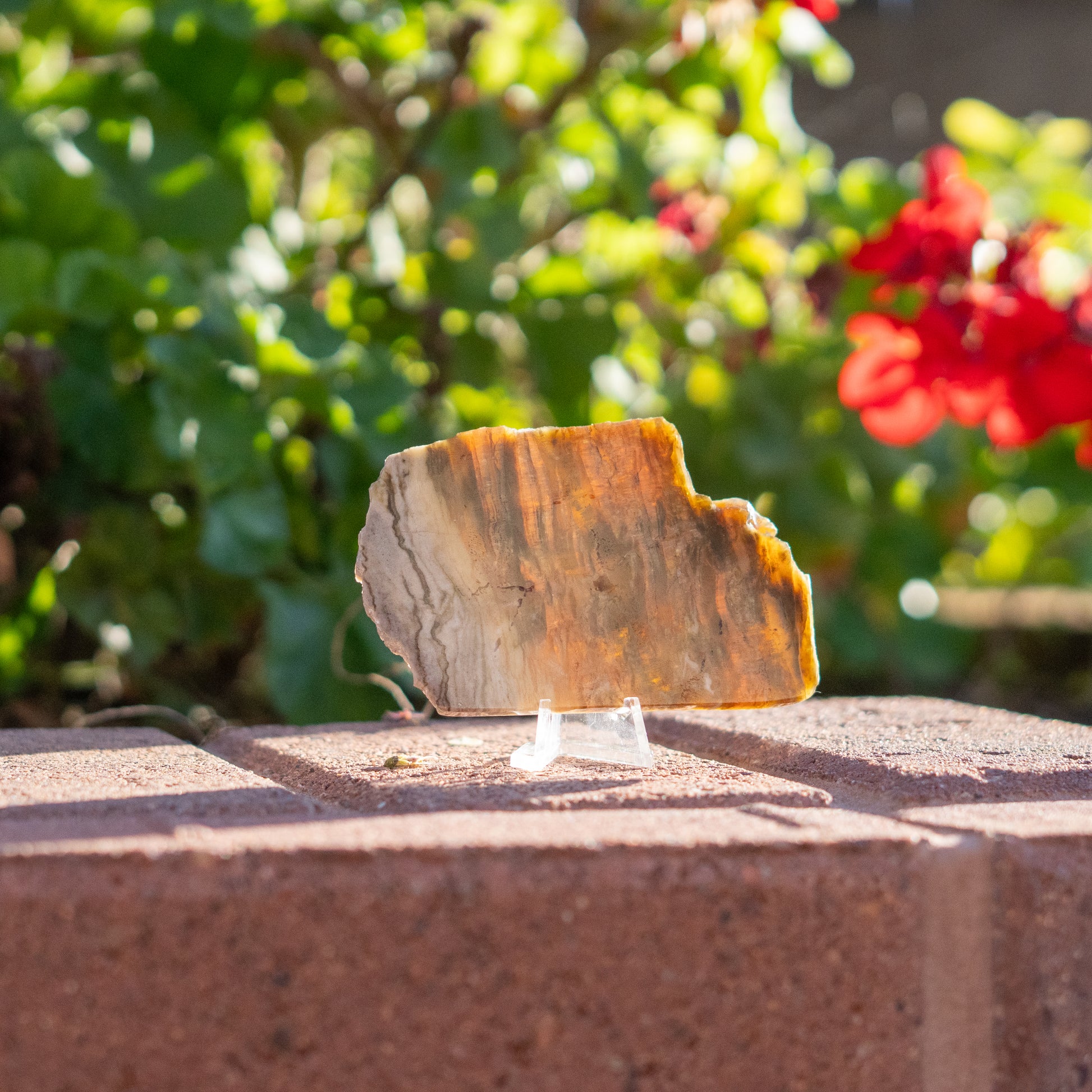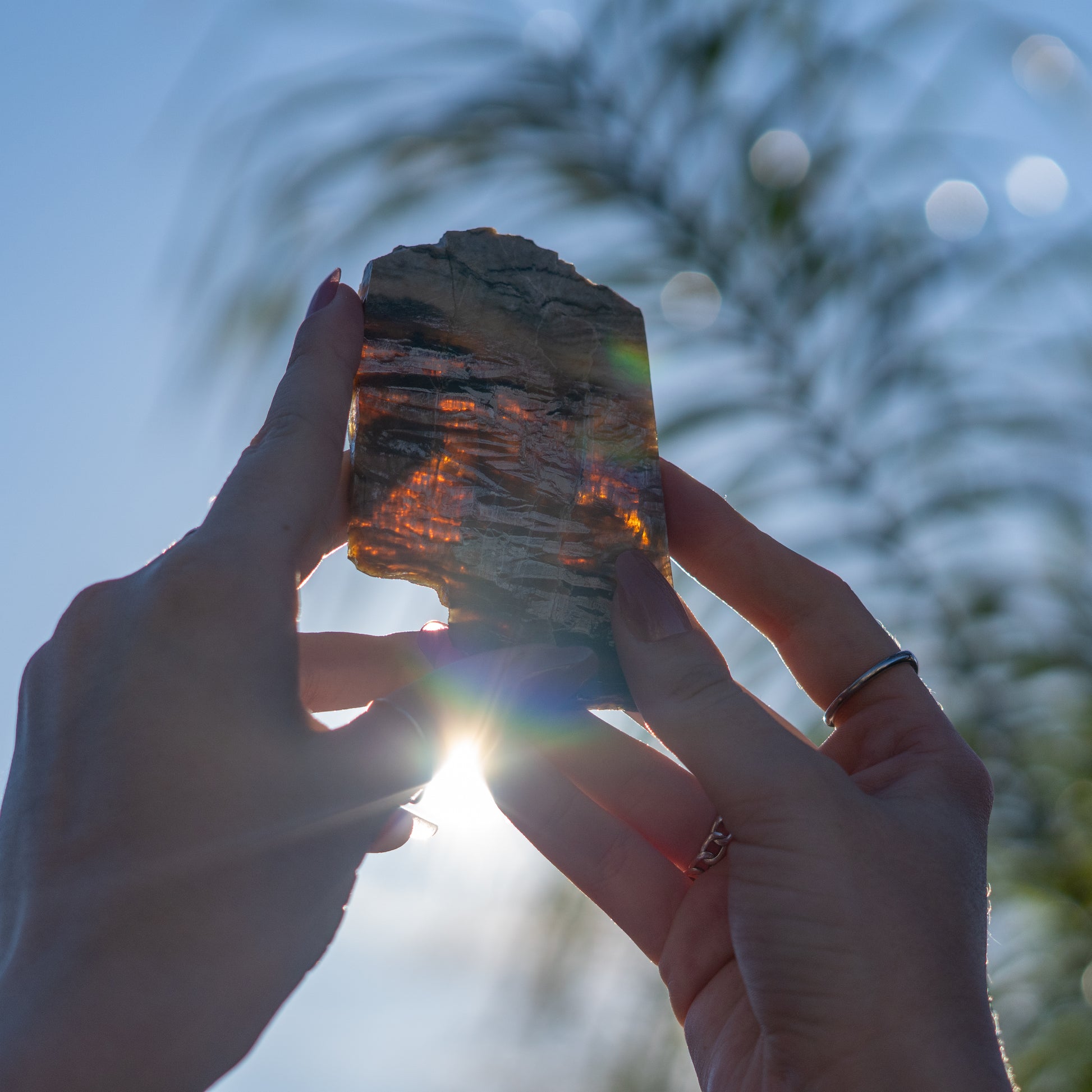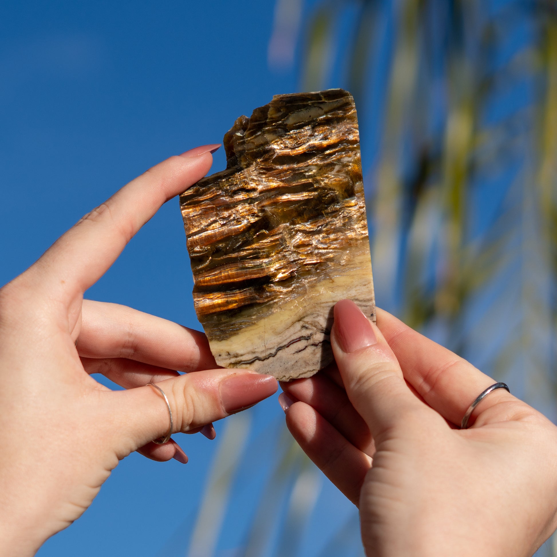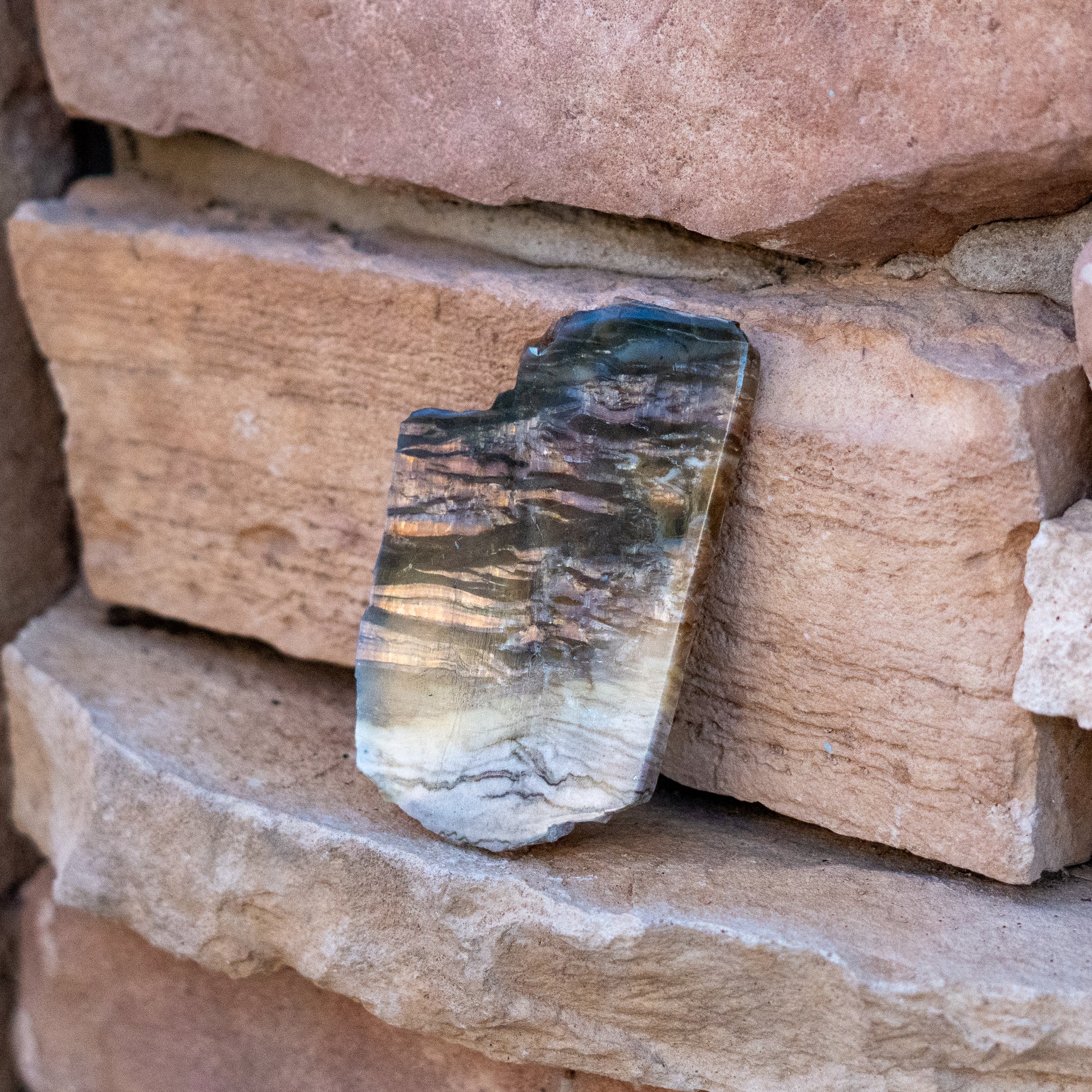 Formed within the ancient landscapes of Arizona, this rare American Pietersite slice carries the unmistakable energy of a gathering storm—both anchoring and electrifying at once. Known as the Tempest Stone, Pietersite is revered for its swirling, chatoyant patterns that seem alive with motion, reflecting its role as a catalyst for inner strength, decisive clarity, and fearless self-expression. This polished slice was selected for its dramatic storm-like bands of gold, brown, and red, exceptional chatoyancy, and potent energetic movement.