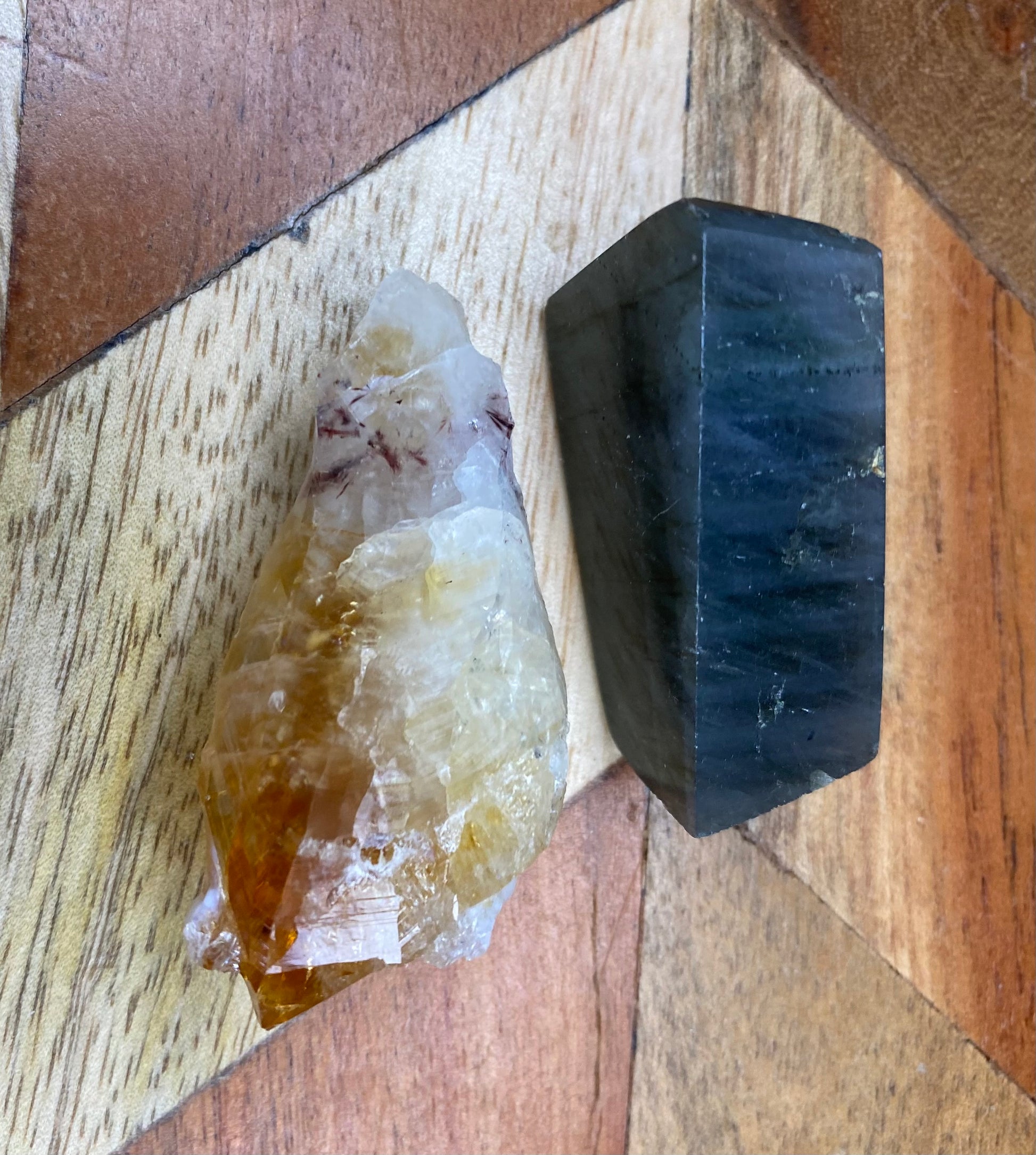 The Polished Dreamy Yellow Labradorite and Golden Citrine Point Set of Two features beautifully crafted crystal points: