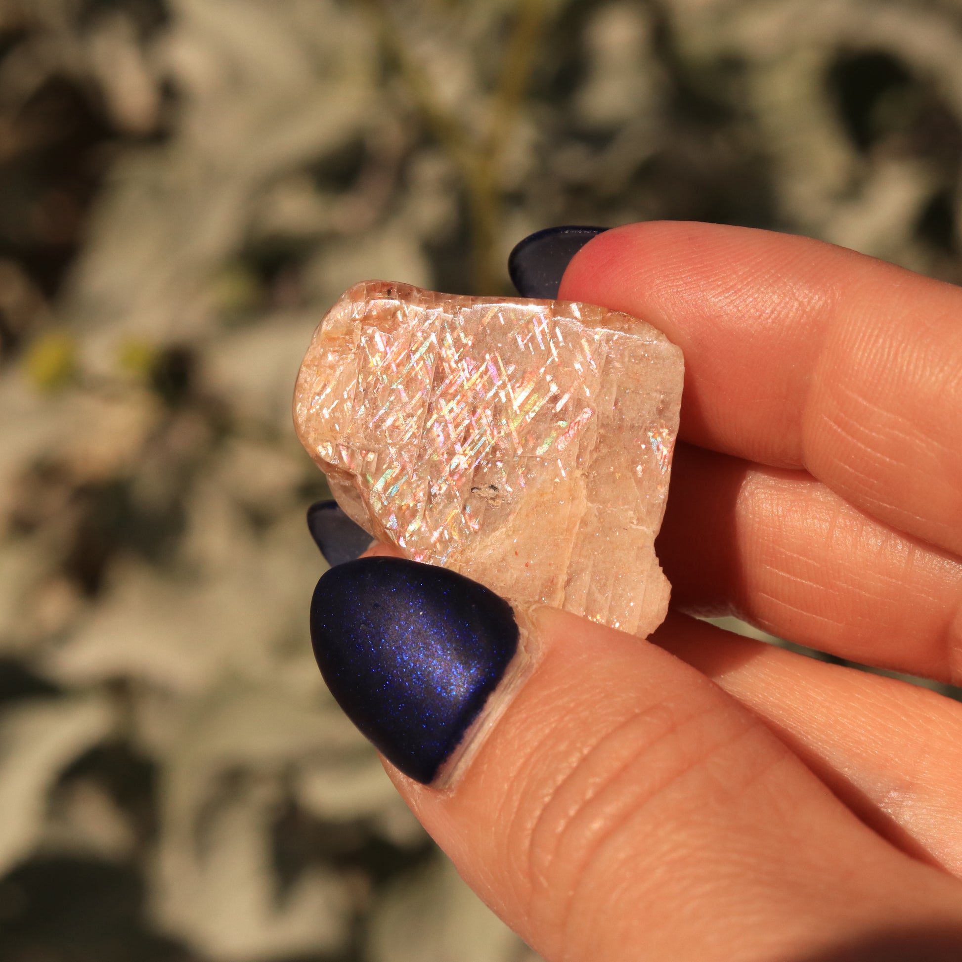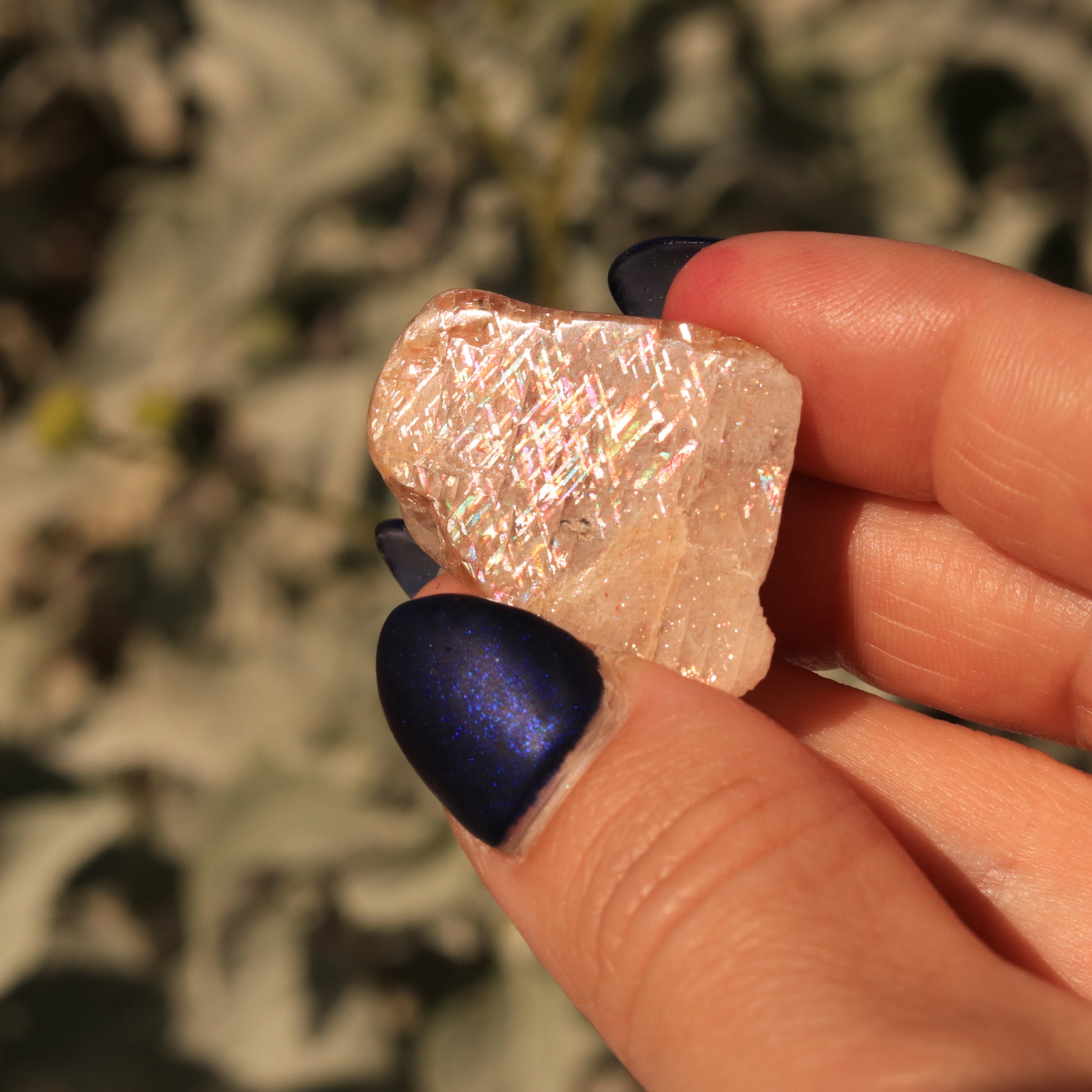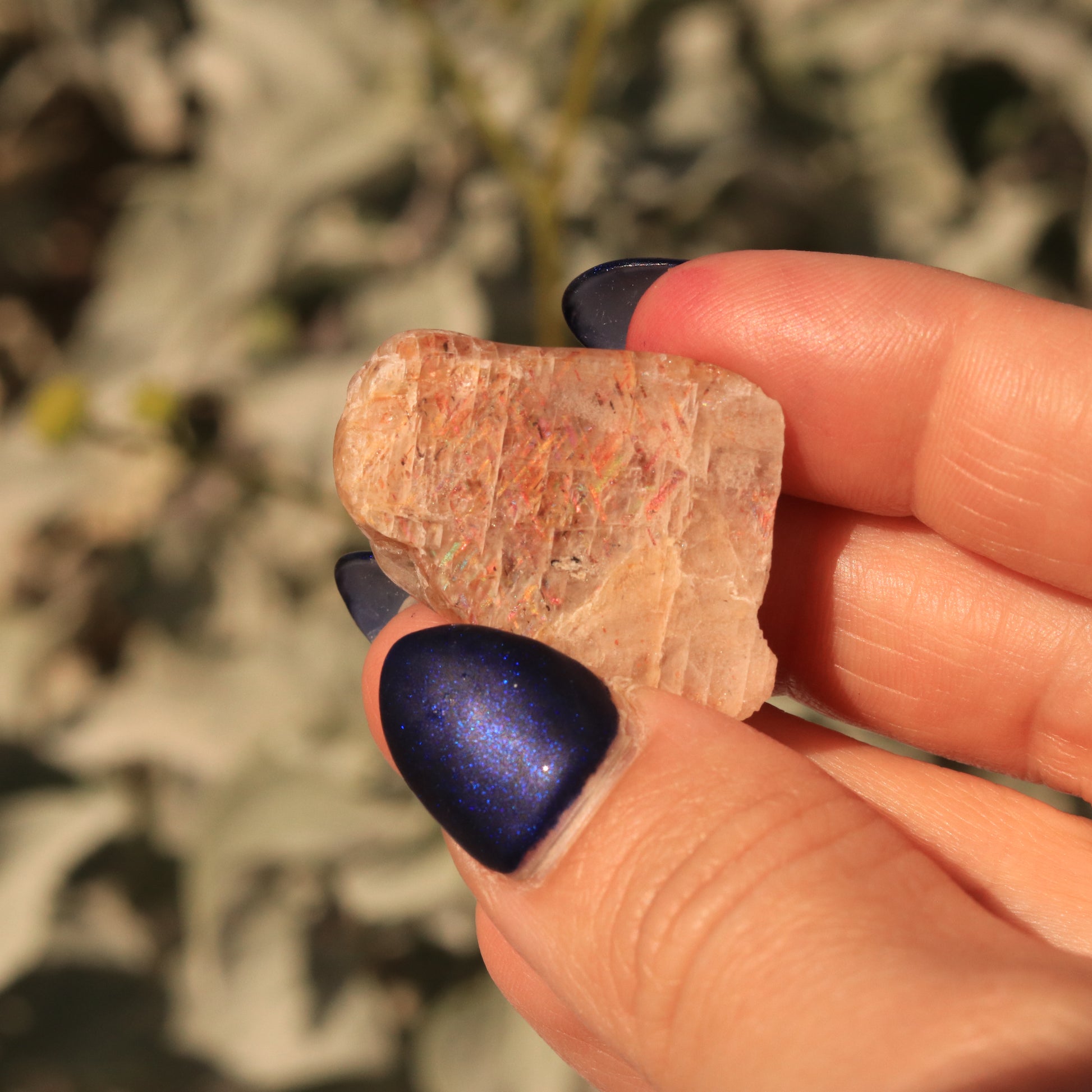 This partially polished Rainbow Lattice Sunstone retains its natural essence while enhancing its signature brilliance, allowing you to experience its celestial radiance in its purest form. As The Official Agent for Rainbow Lattice Sunstone in the United States, Earth Family Crystals is proud to offer this exquisite and highly coveted gem to seekers, collectors, and energy workers alike. These photos were taken in 100% natural sunlight in the Sonora Desert and are completely unedited to showcase the natural beauty of this stone.