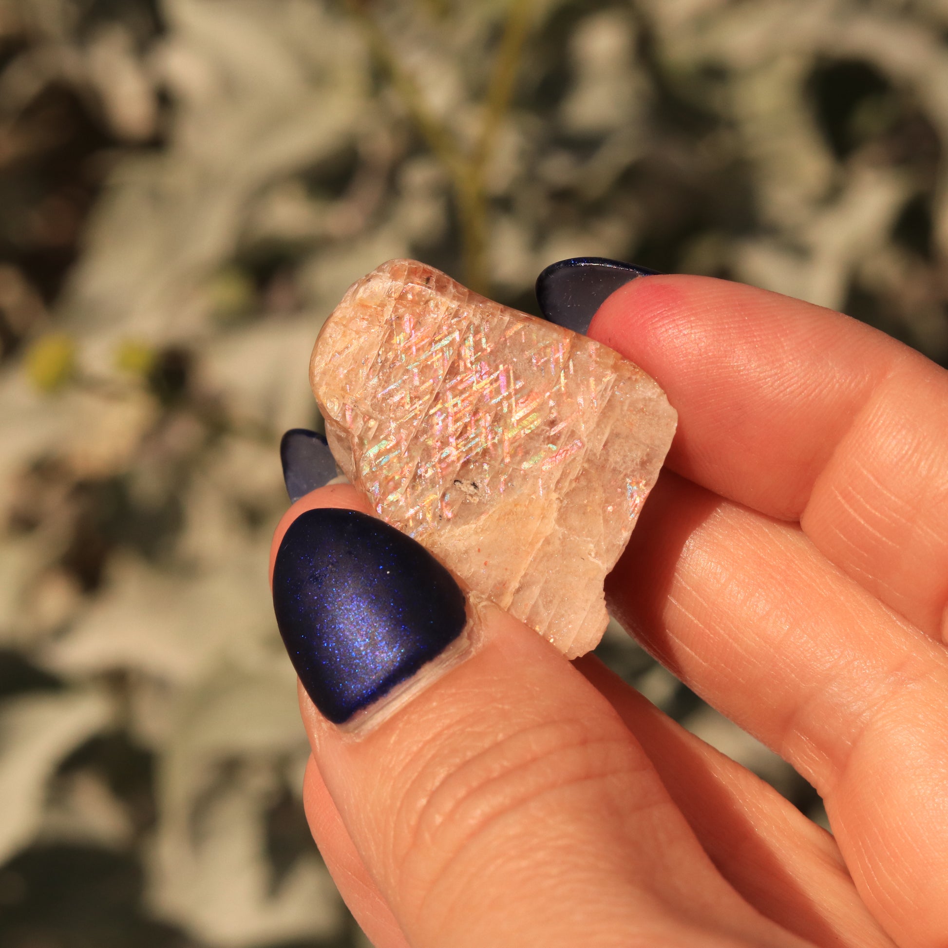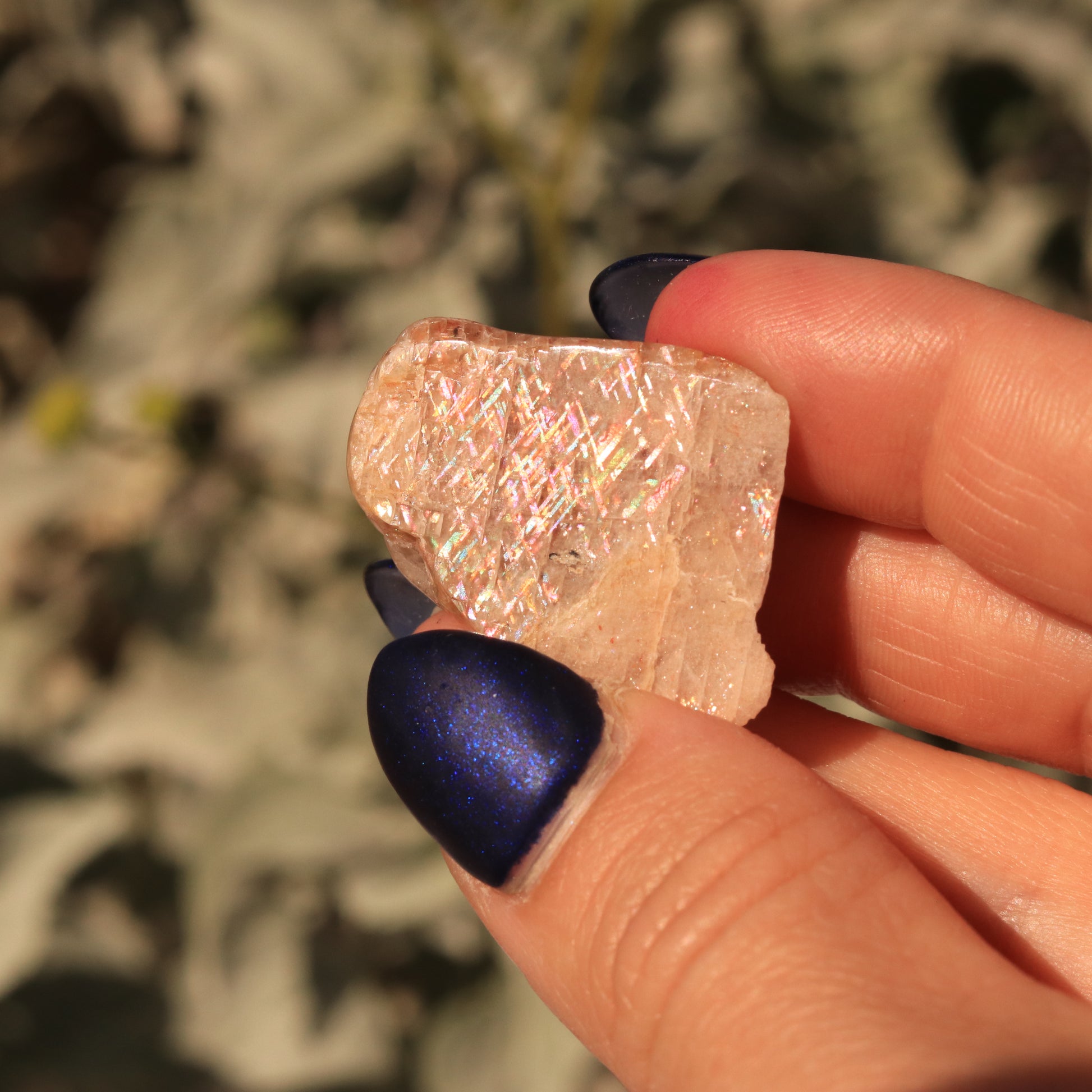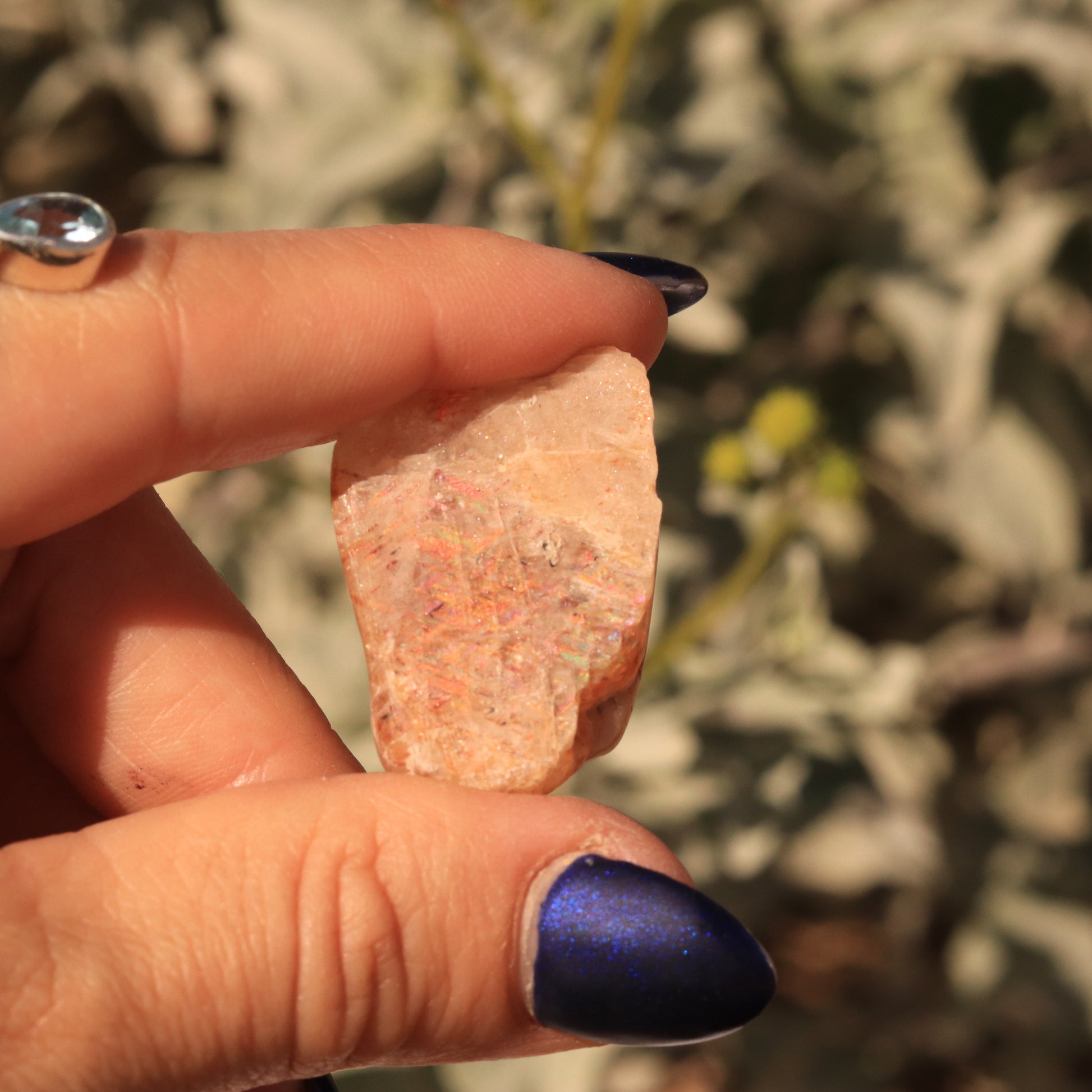 This partially polished Rainbow Lattice Sunstone retains its natural essence while enhancing its signature brilliance, allowing you to experience its celestial radiance in its purest form. As The Official Agent for Rainbow Lattice Sunstone in the United States, Earth Family Crystals is proud to offer this exquisite and highly coveted gem to seekers, collectors, and energy workers alike. These photos were taken in 100% natural sunlight in the Sonora Desert and are completely unedited to showcase the natural beauty of this stone.