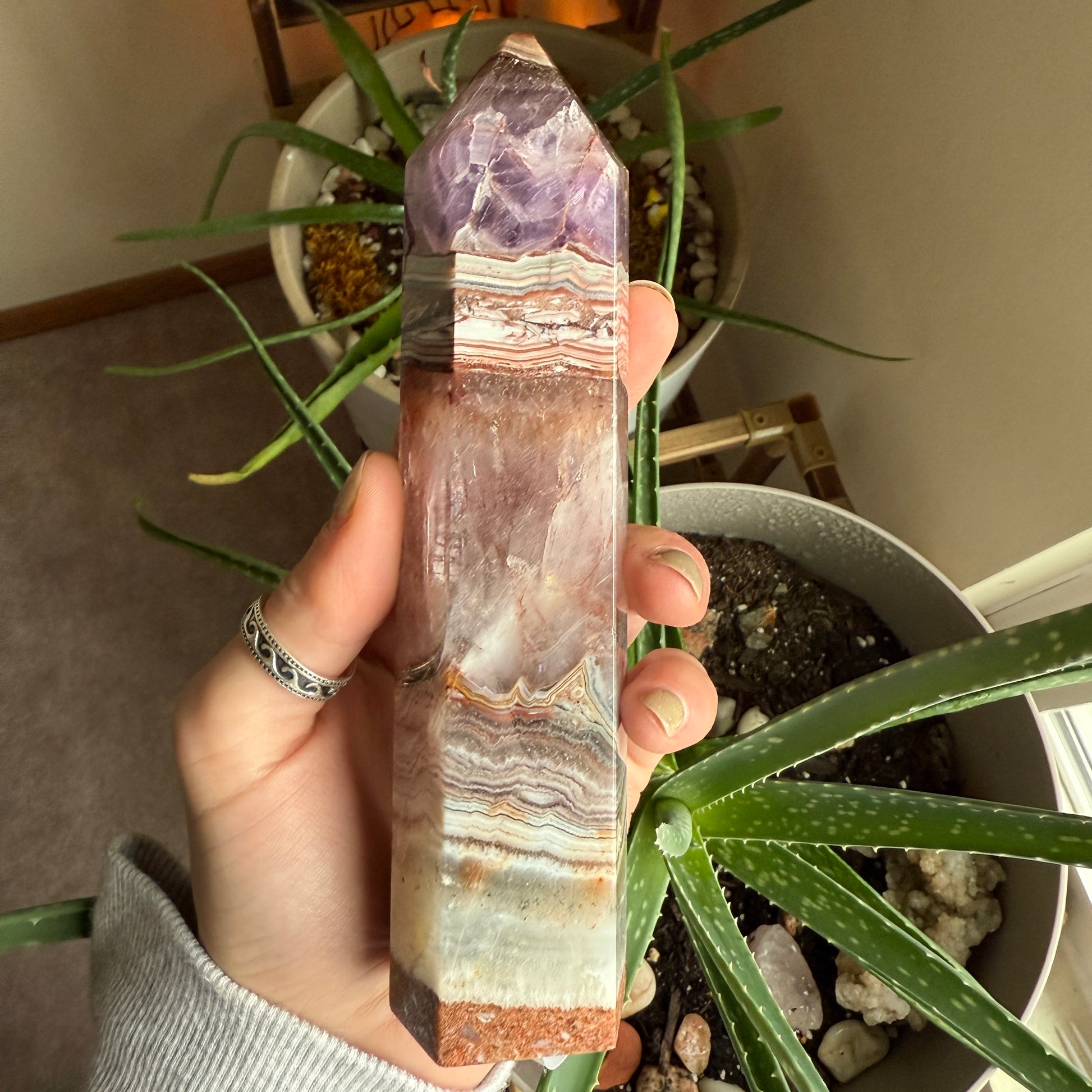 This rare find combines the calming energy of Amethyst, the grounding nature of Agate, and the amplifying power of Quartz into a stunning tower. Featuring intricate agate banding and a unique mix of pastel and earthy tones, this piece radiates serenity and balance, making it a perfect centerpiece for any crystal collection or sacred space.