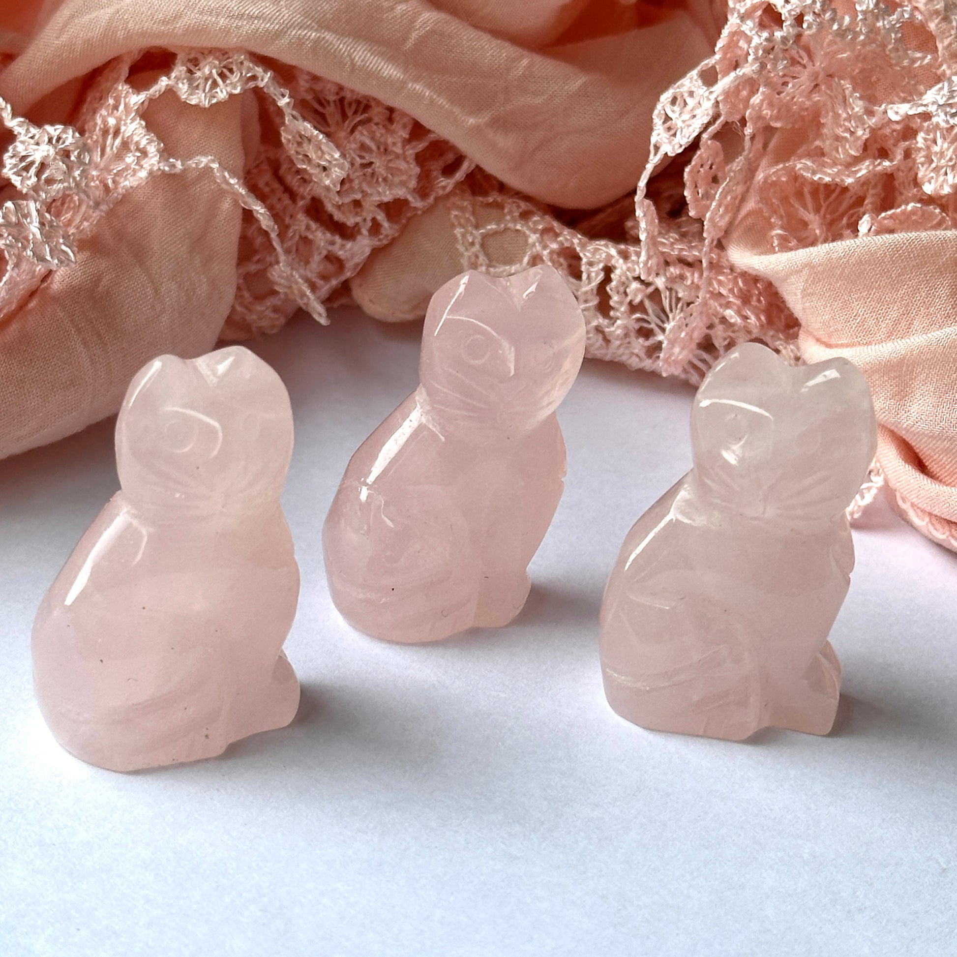 The feline form enhances the symbolic power of this piece—cats are known as spiritual guardians, beings of independence, mystery, and comfort. Combined with the loving energy of Rose Quartz, these cat carvings become protective allies for emotional support and personal empowerment.