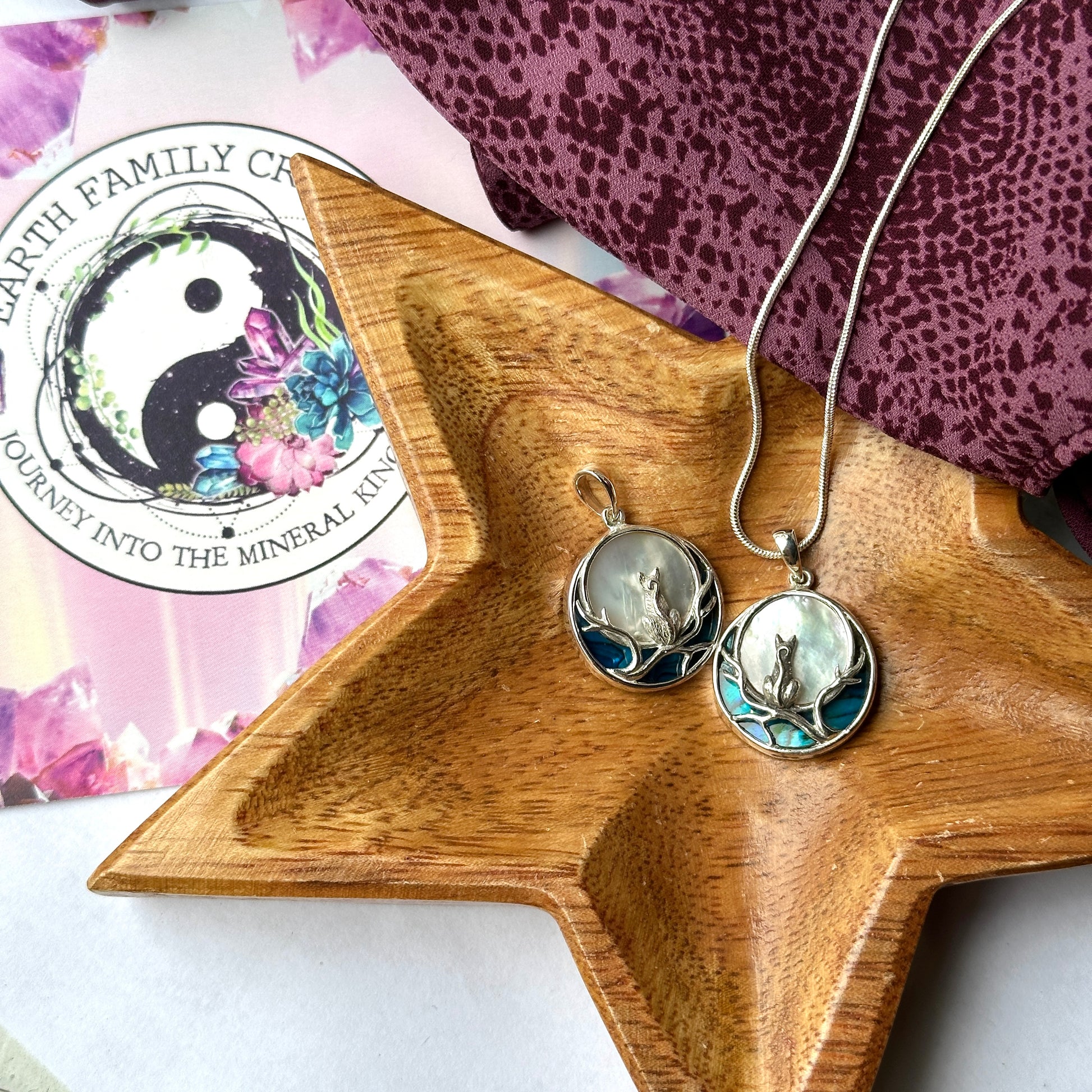 These beautiful silver pendants feature a cat sitting on a branch in front of a full moon. Abalone shell provides energies of protection and balance, making this piece ideal for those on a path of self-discovery.