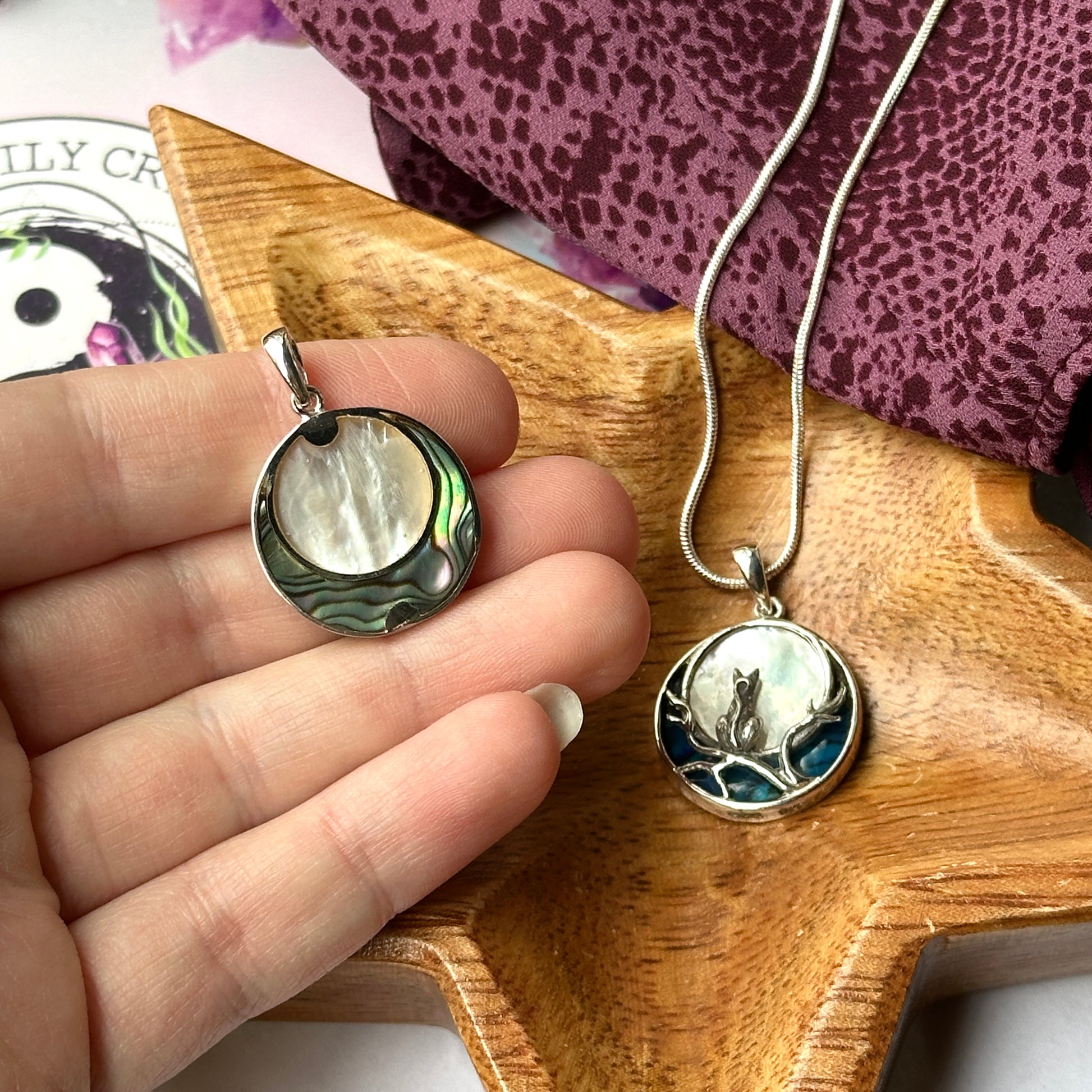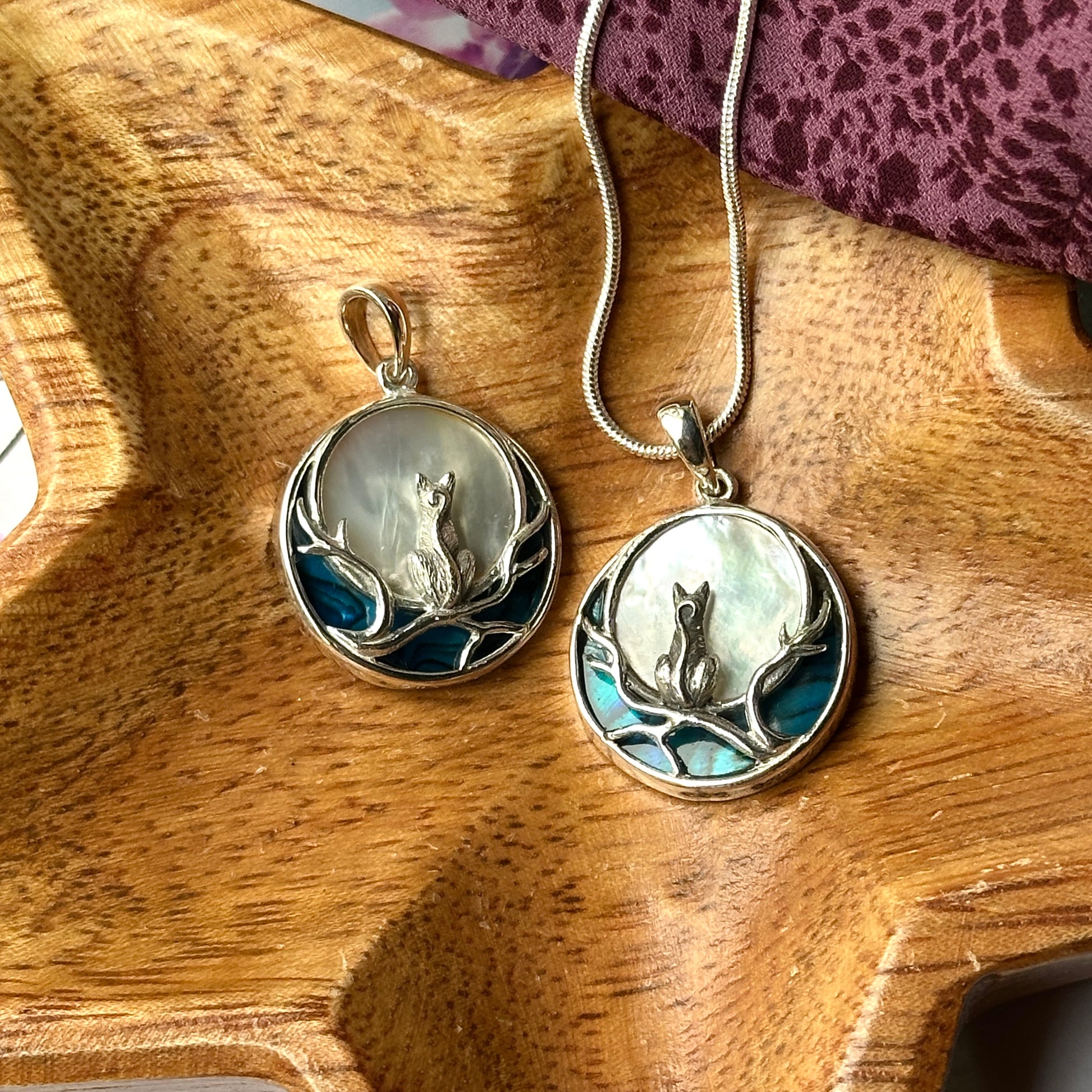 Cat and Moon Abalone Shell Pendants in Sterling Silver ~ Includes Silver Chain