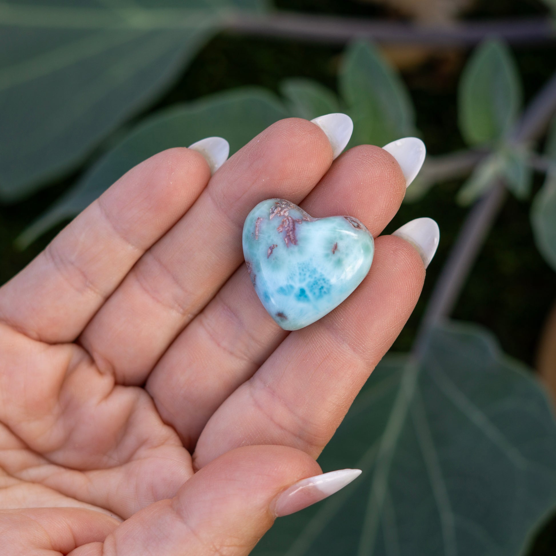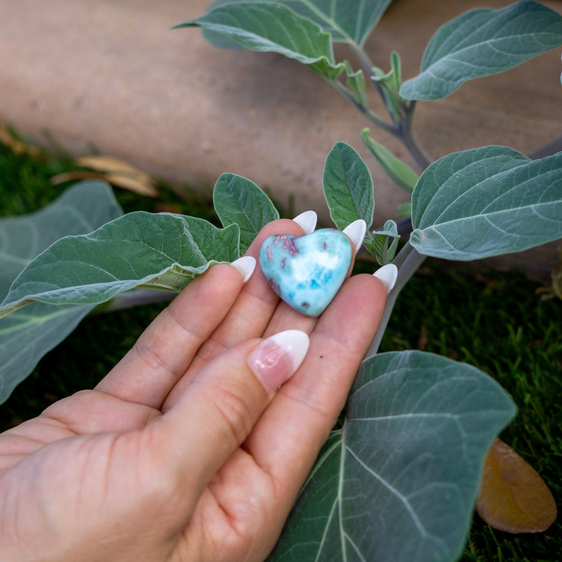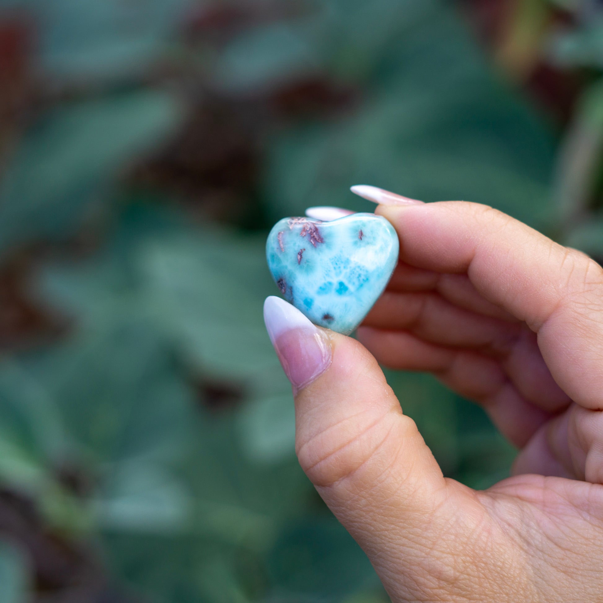 Hand-carved into a graceful heart shape, this Larimar gem beautifully symbolizes love, compassion, and emotional healing. Its marbled waves of aqua, white, and pale teal mirror the tides and clouds, inviting peace, emotional clarity, and heart-centered awareness.