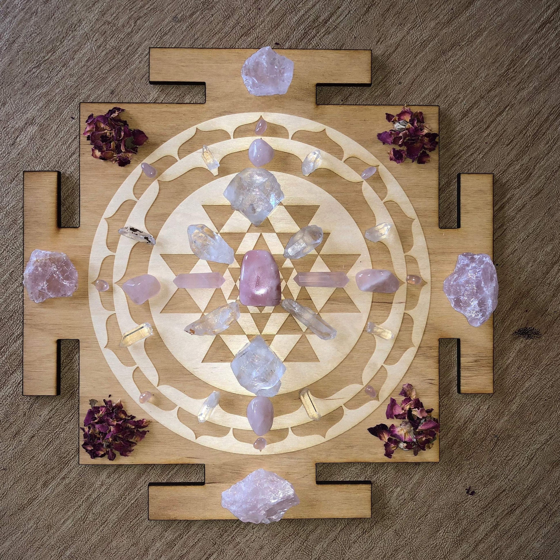 This is a Sri Yantra crystal grid made out of Birch wood. These are made to order, you can choose between approximately