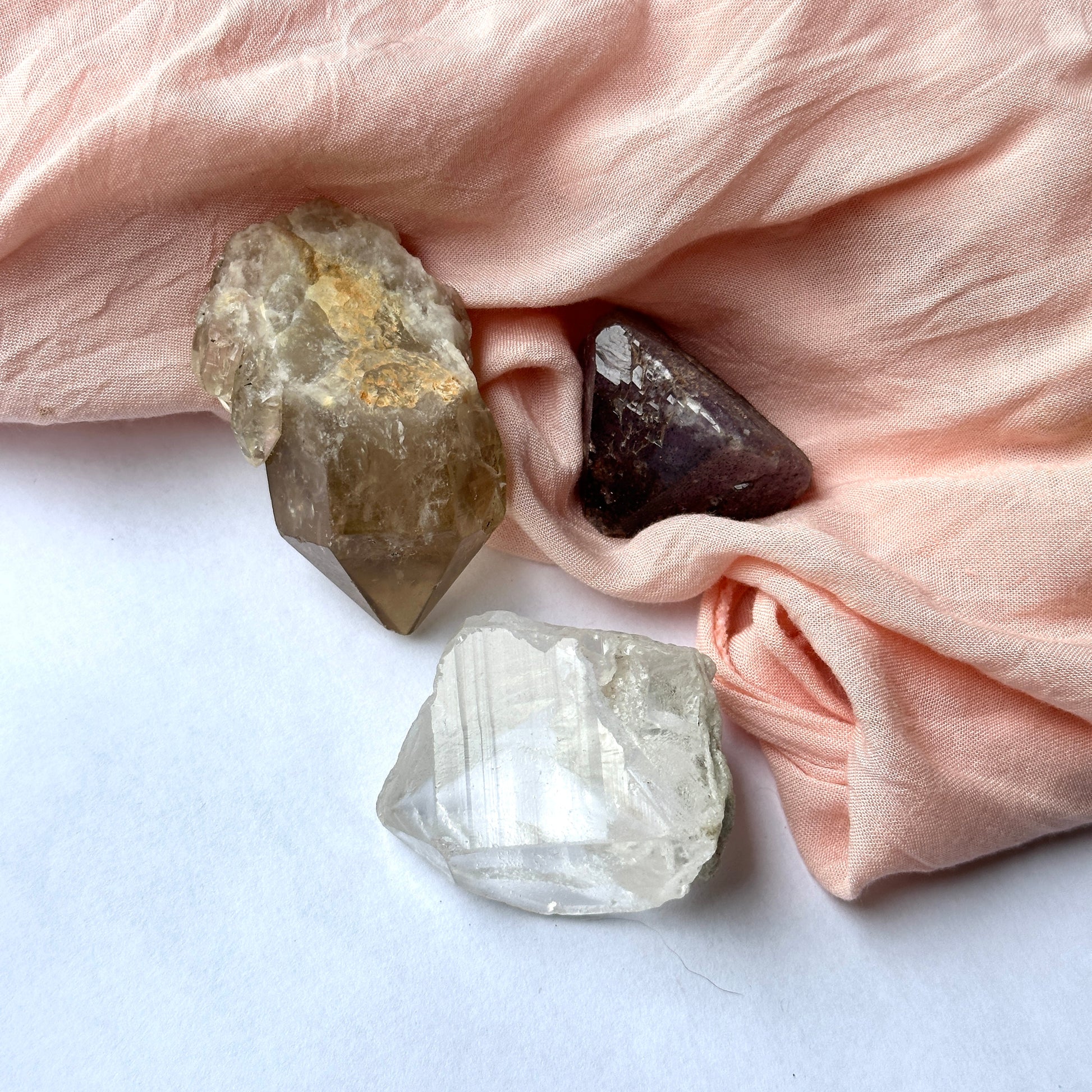 Dimensions: approx. 6cm (citrine), 5cm (clear quartz), and 3cm (amethyst)