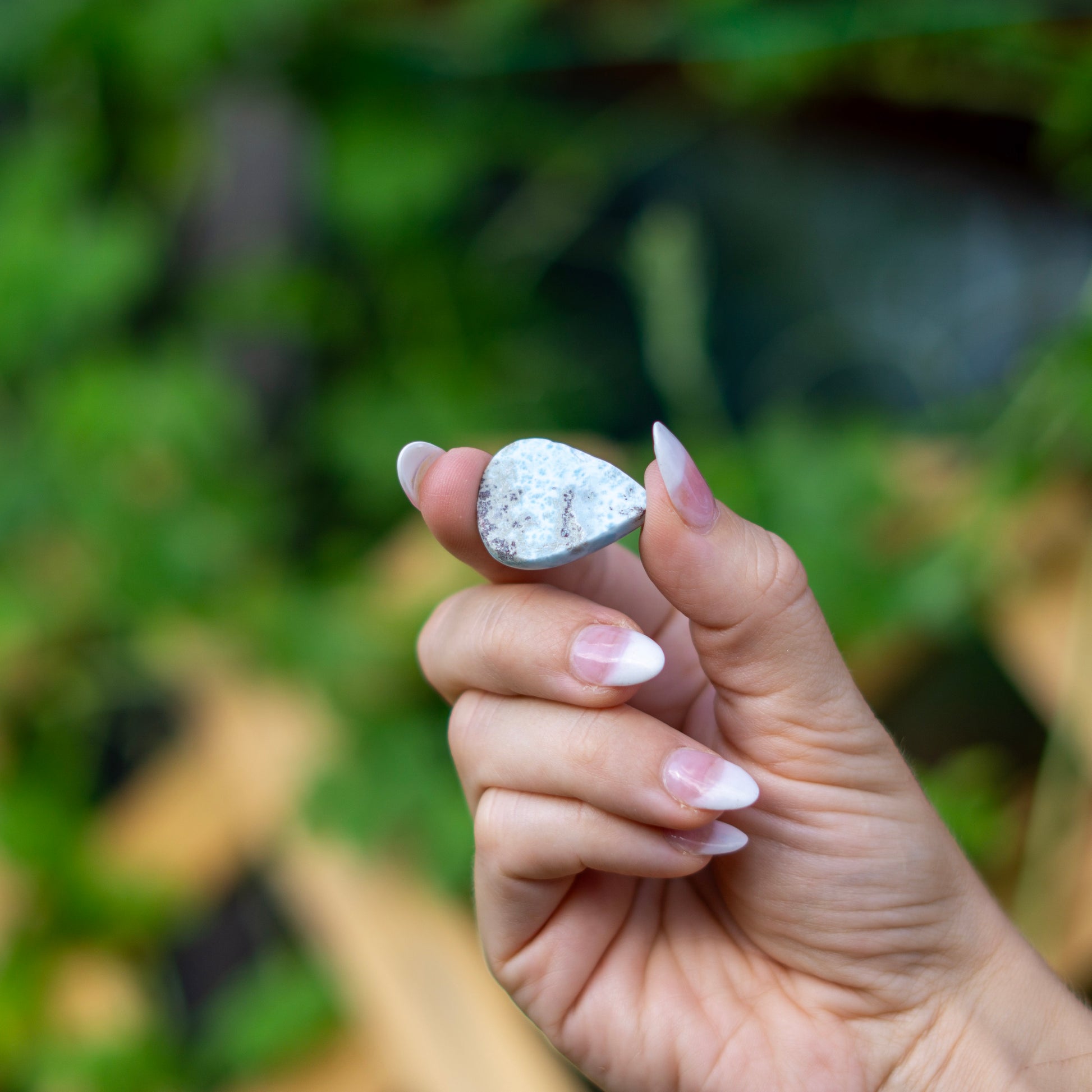 Hand-polished into an elegant cabochon form, this Larimar gem honors the tranquil flow of water and the gentle power of transformation. Its marbled waves of aqua, white, and pale teal mirror the tides and clouds, inviting peace, emotional clarity, and heart-centered awareness.
