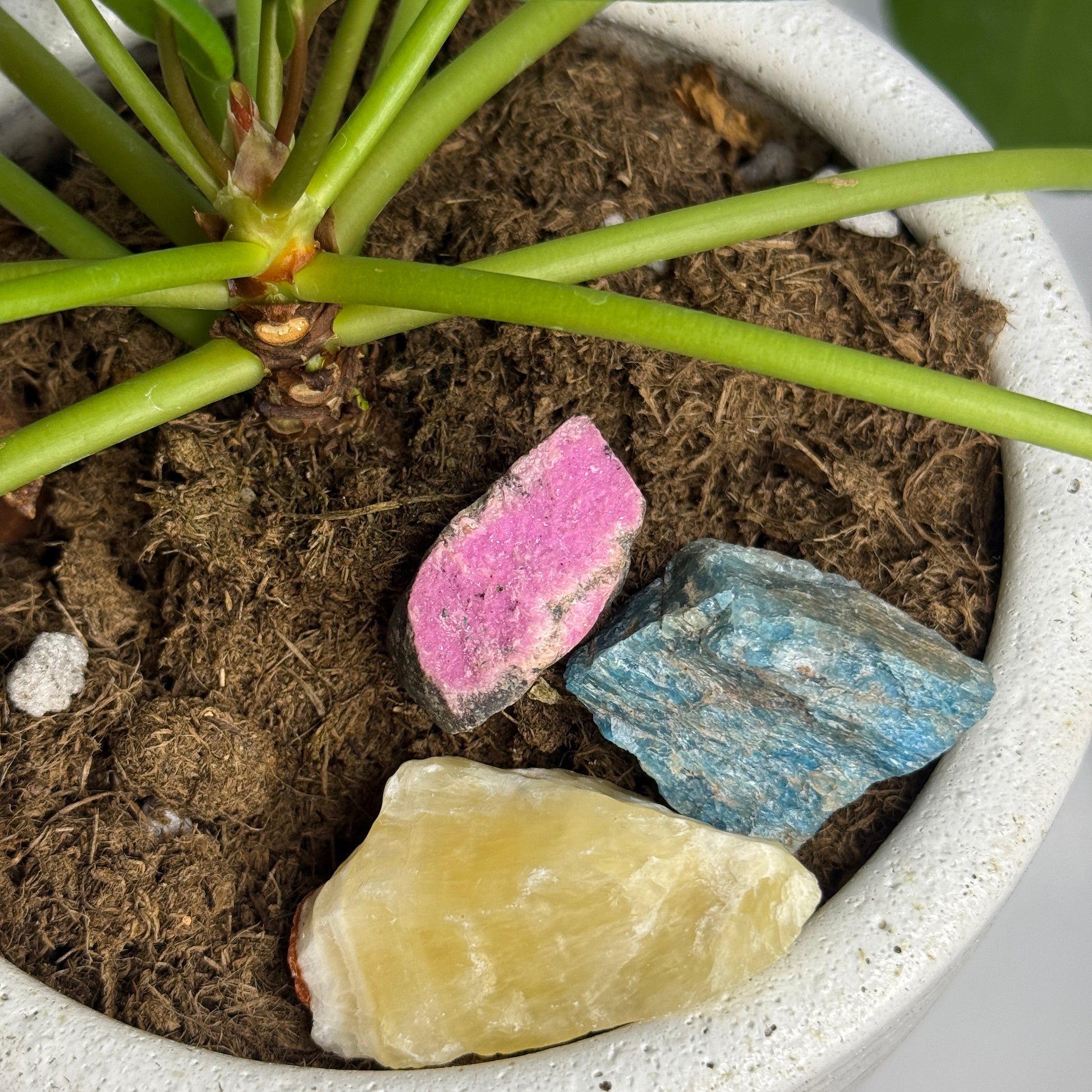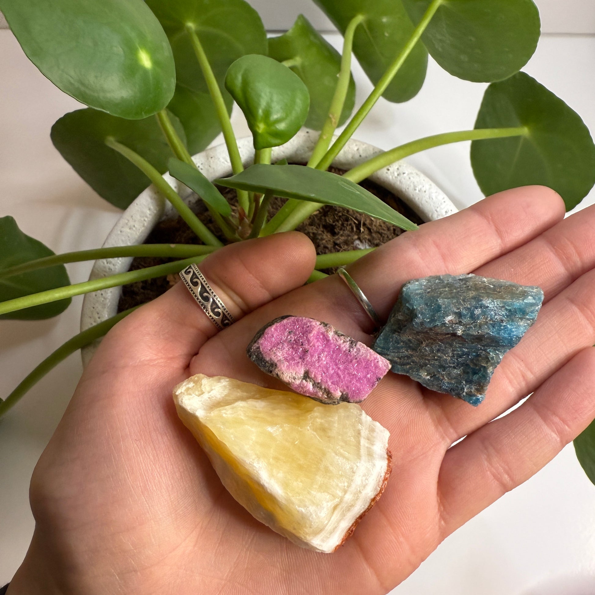 Three-Piece Raw Gemstone Set: Pineapple Calcite, Sparkling Pink Aragonite, and Blue Apatite for Energy, Emotional Balance, and Creativity