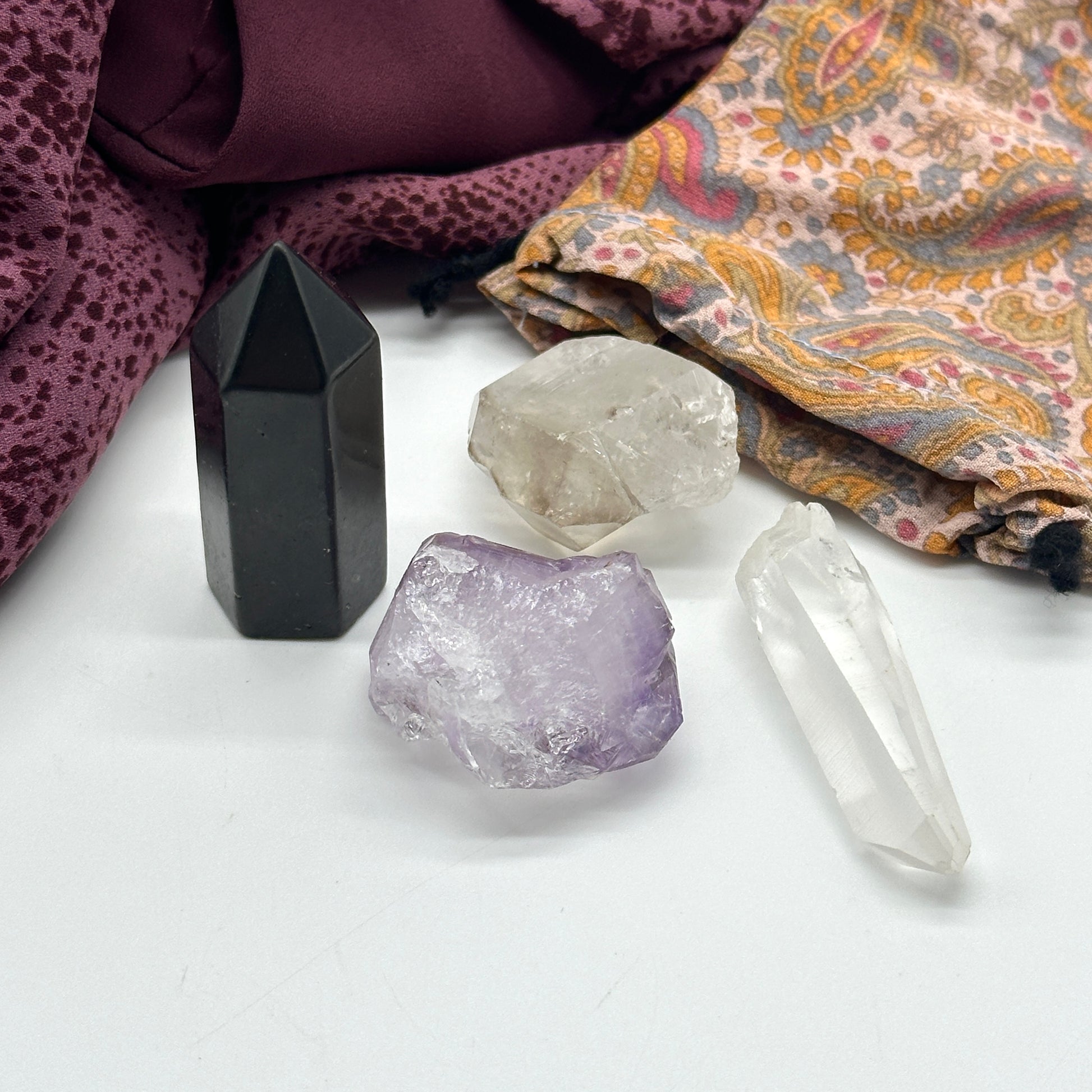 Crystal Set of Four Includes: Tibetan Smoky Quartz DT Point, Amethyst Rutile Natural Point, Mini Lemurian Seed Quartz Crysal, Mini Shungite Tower