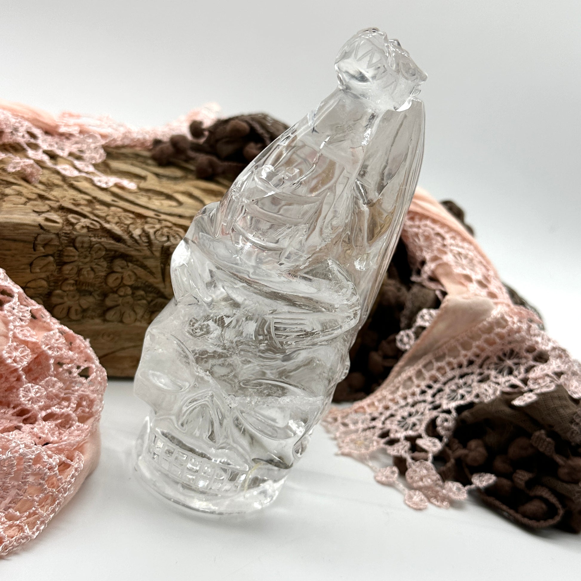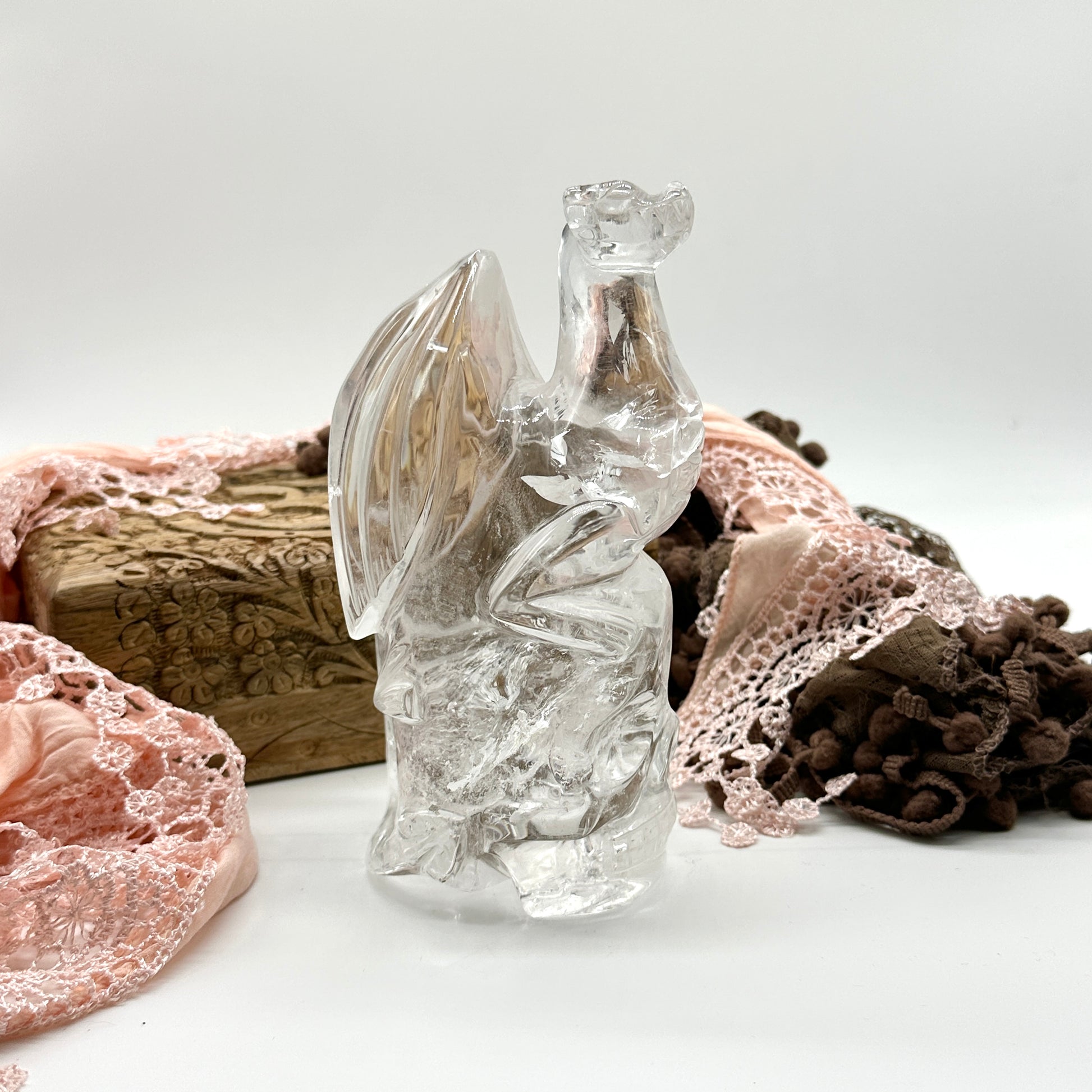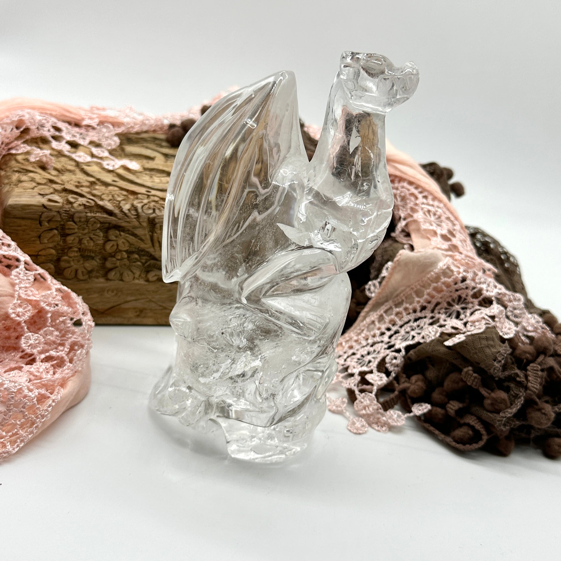 This breathtaking Clear Quartz Dragon Perched on a Skull Sculpture is an exceptional statement piece, expertly carved from high-quality, ultra-clear quartz in Brazil. This one-of-a-kind crystal carving captures the powerful symbolism of the dragon—a symbol of strength, wisdom, and transformation—alongside the skull, which represents the cycle of life, death, and rebirth. This unique quartz sculpture is not only visually captivating but also offers potent metaphysical benefits, making it a must-have addition for crystal collectors and spiritual practitioners alike.