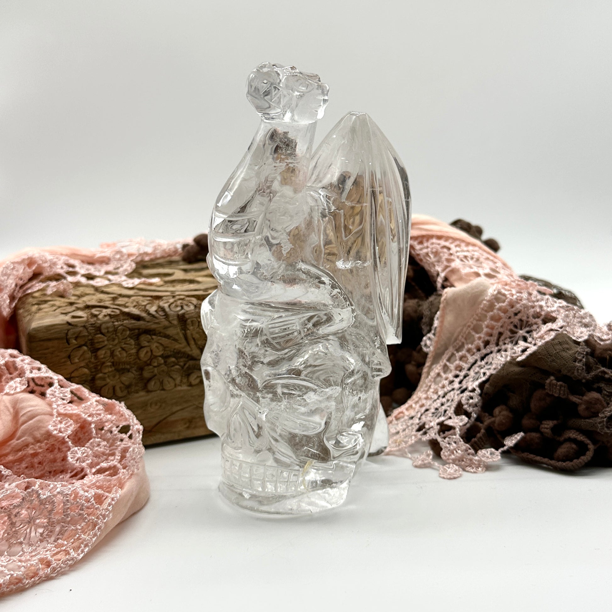 This listing is for the exact incredible clear quartz dragon and skull crystal carving pictured here.
